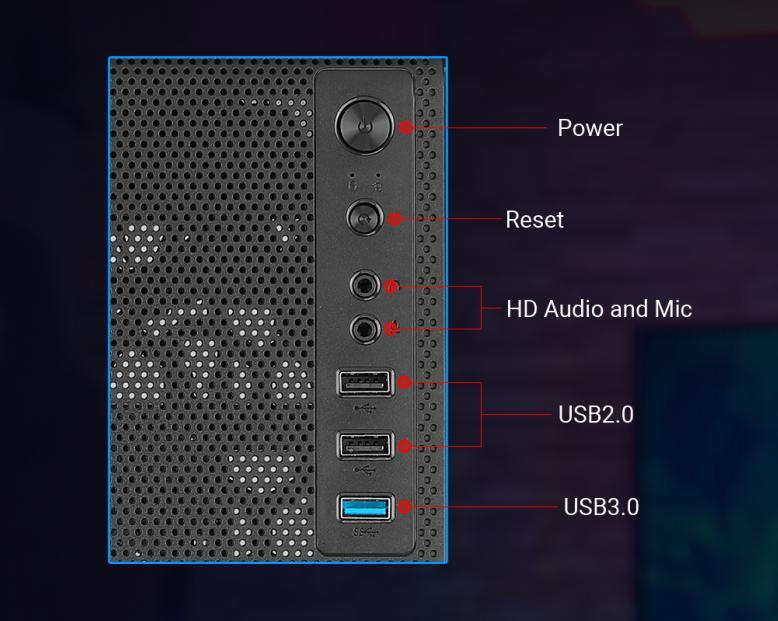 Γρήγορη και εύκολη πρόσβαση σε USB 3.0 x 1, USB 2.0 x 2, θύρες ήχου και μικροφώνου HD και κουμπί λειτουργίας και reset.
