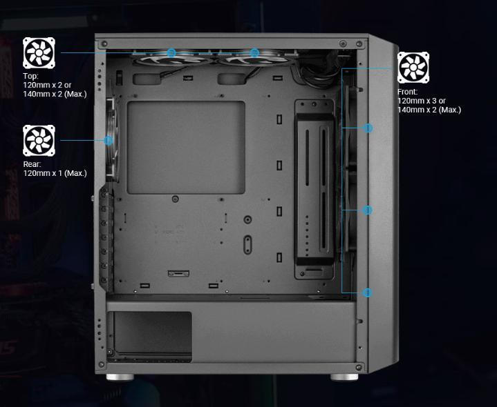 - Μπροστινό μέρος: 120 mm x 3 ή 140 mm x 2 (περιλαμβάνεται μαύρος ανεμιστήρας 120 mm x 2)