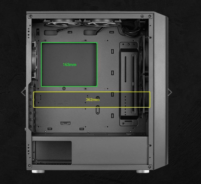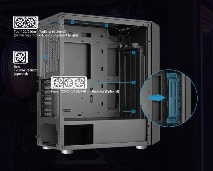 - Εμπρός: 120/240/280/360mm Ψυγείο (Προαιρετικό) (για 360mm, μήκος ψυγείου <395mm) (για 240/280/360mm, ψυγείο συν συνολικό πάχος ανεμιστήρα <58mm)