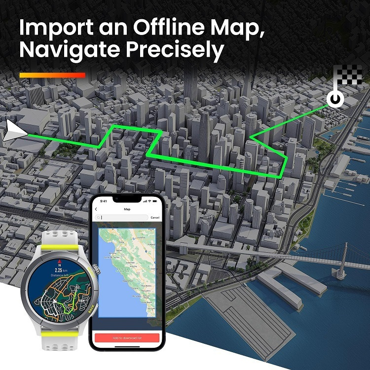 Κατέβασε χάρτες περιοχών από την εφαρμογή Zepp και αποθήκευσέ τους στο ρολόι για offline χρήση. Συνδύασέ τους με προσαρμοσμένες διαδρομές και τρέξε με ακρίβεια, ακόμα κι αν δεν έχεις ξαναβρεθεί στη διαδρομή. Μπορείς επίσης να αποθηκεύεις σημεία διαδρομής για να τα επισκεφτείς ξανά όποτε θέλεις.