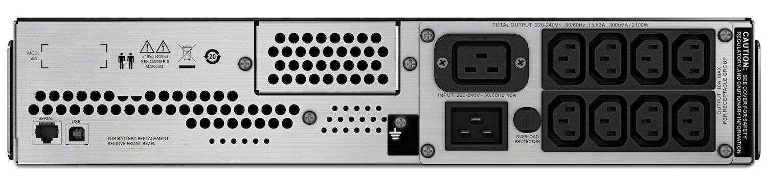 Το Smart-UPS C Line-Interactive 3000VA 2100W με 8 IEC Πρίζες της APC είναι ένα Tower UPS με 8 πρίζες τύπου IEC (όπως αυτή των τροφοδοτικών για υπολογιστές). Η λειτουργία του είναι (VI) Line-Interactive που προσαρμόζει την τάση εξόδου συνεχώς μέσω αυτόματου ρυθμιστή τάσης προστατεύοντας από αυξομειώσεις της τάσης και διακοπές του ρεύματος. Η μπαταρία του μπορεί να κρατήσει 14 λεπτά με μισό φορτίο ή 4 λεπτά με πλήρες φορτίο (όταν οι συσκευές που έιναι συνδεδεμένες τραβάνε το μισό ή το μέγιστο ρεύμα που μπορεί να δώσει το UPS αντίστοιχα). Προσφέρει ρεύμα καθαρού ημιτόνου που είναι κατάλληλο για ευαίσθητες συσκευές (πχ ιατρικά μηχανήματα) και προτιμάται για συσκευές με τροφοδοτικά που έχουν active PFC προστασία (πχ υπολογιστές).