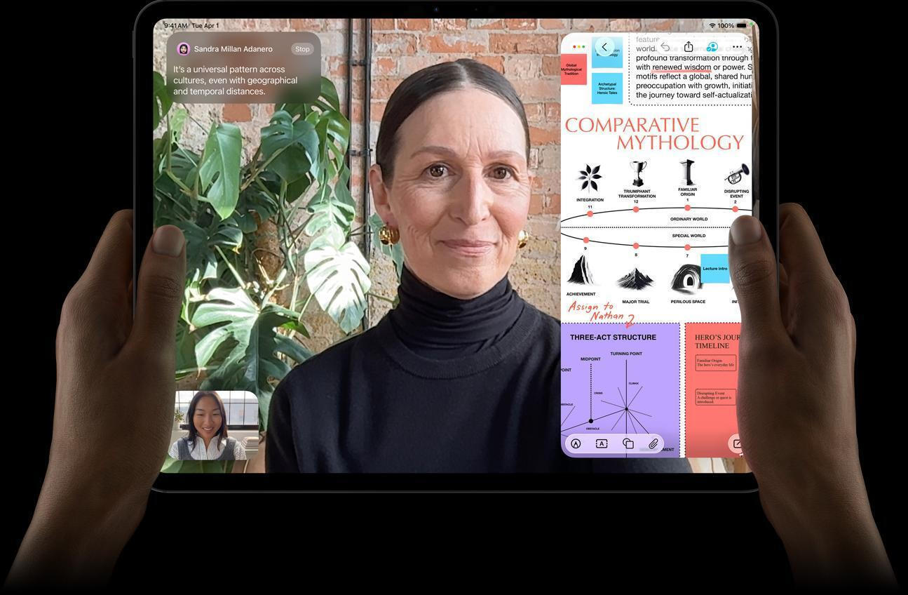 Το iPad Pro διαθέτει κάμερα 12 MP Center Stage οριζόντιου προσανατολισμού και κάμερα 12 MP με Ευρυγώνιο φακό και προσαρμοστικό φλας True Tone. Τα τέσσερα μικρόφωνα επαγγελματικής ποιότητας και το ηχοσύστημα τεσσάρων ηχείων προσφέρουν πλούσιο ήχο.