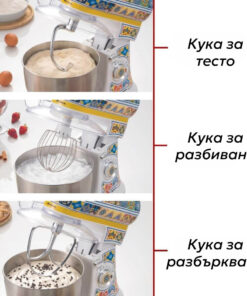 - 3 εξαρτήματα: γάντζος ζύμης, αναδευτήρας, συρμάτινο εξάρτημα