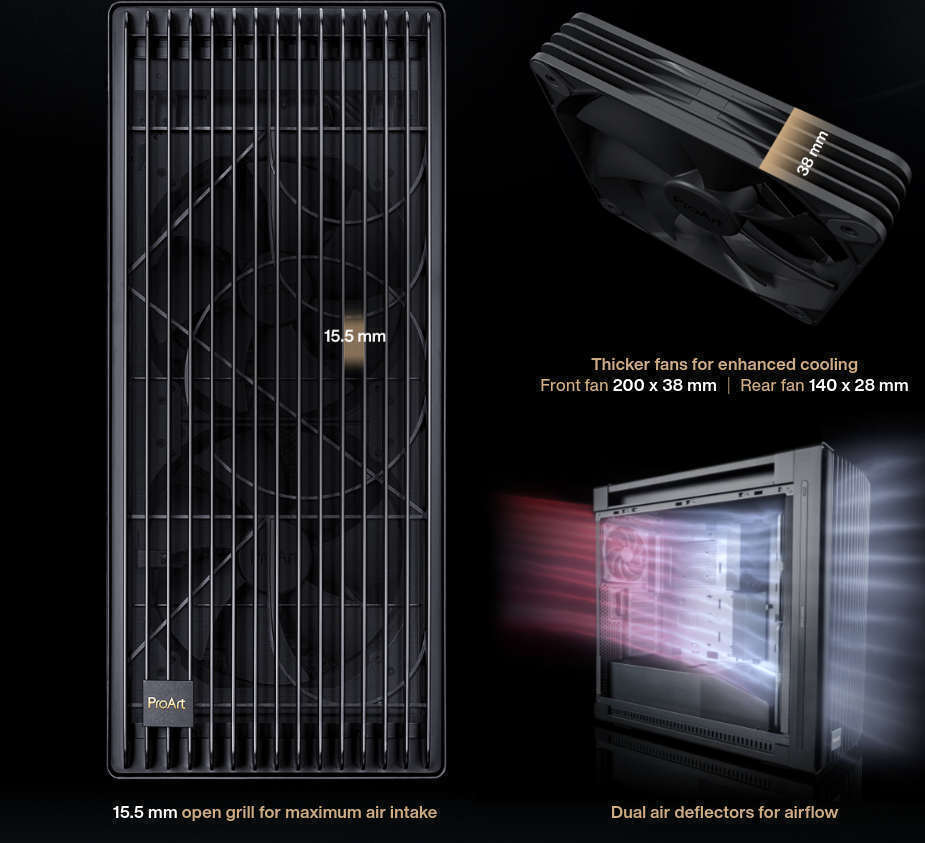 Σχεδιασμένο για βέλτιστη ροή αέρα και ενισχυμένη ψύξη, το περίβλημα του ProArt PA602 είναι ένα όνειρο για τους επαγγελματίες του δημιουργικού χώρου που αναζητούν στοχευμένες διαδικασίες εργασίας. Με ένα μπροστινό πάνελ σχεδιασμένο για μέγιστη εισαγωγή αέρα, παχύ προεγκατεστημένο πίσω ανεμιστήρα 140 mm και δύο μπροστινούς ανεμιστήρες 200 mm, ενσωματωμένη πλήμνη ανεμιστήρα και υποστήριξη για ένα ψυγείο 420 mm στην κορυφή, παρέχει κορυφαίες επιδόσεις από την πρώτη στιγμή. Το ProArt PA602 απευθύνεται σε όσους αναζητούν thermal solutions υψηλών προδιαγραφών. Παράλληλα, ο μινιμαλιστικός σχεδιασμός εξασφαλίζει στους δημιουργούς τη δυνατότητα να εργάζονται με λιγότερους περισπασμούς.