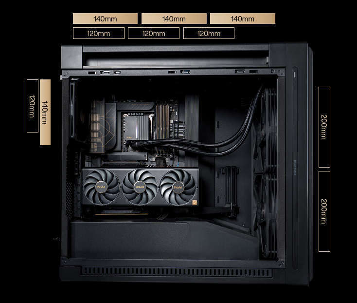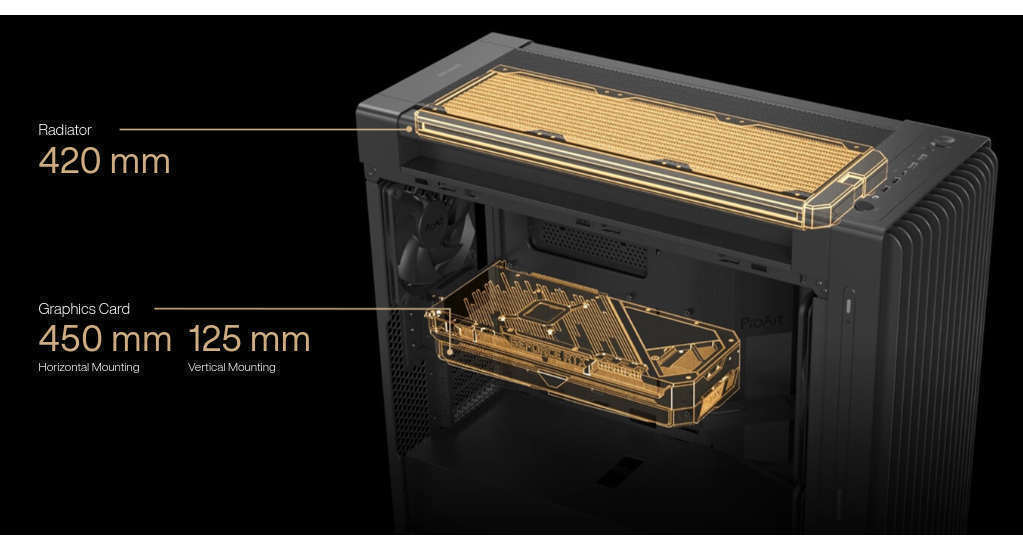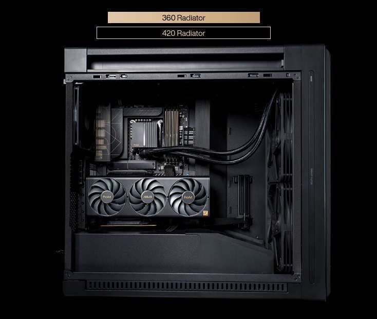 Το ProArt PA602 υποστηρίζει ένα ψυγείο 420 mm για ψύξη AIO ή προσαρμοσμένους βρόχους υγρής ψύξης. Παρέχει επίσης επαρκή χώρο για τις πιο ισχυρές κάρτες γραφικών τόσο σε οριζόντια όσο και σε κάθετη θέση τοποθέτησης.