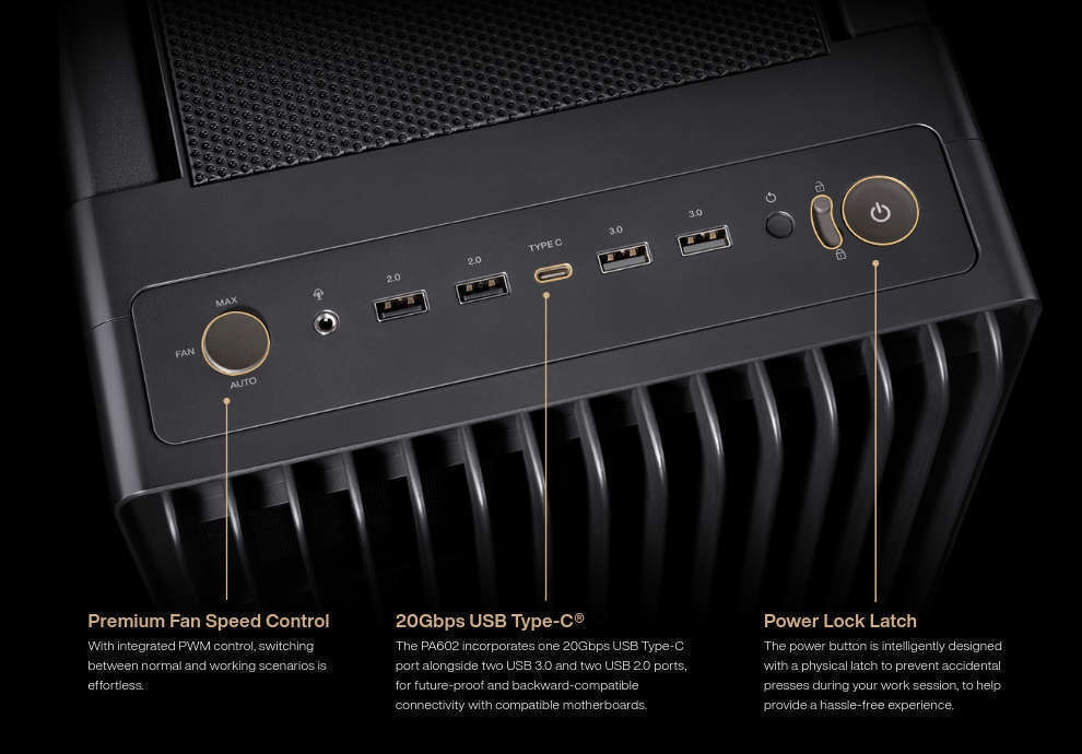 Ο PA602 διαθέτει ανοιχτή μπροστινή γρίλια 15,5 mm με πορώδες 45% για μεγιστοποίηση της ροής του αέρα και του εξαερισμού. Εν τω μεταξύ, οι εξαιρετικά μεγάλοι σε πάχος ανεμιστήρες PWM αποδίδουν πολύ υψηλή ροή αέρα με χαμηλό θόρυβο, ενώ οι προεγκατεστημένοι διπλοί ανεμηστήρες συνεργάζονται για να βοηθήσουν στη συγκέντρωση του ψυχρού αέρα τόσο για τις κάρτες γραφικών όσο και για την εισαγωγή αέρα του ψύκτη CPU, ενισχύοντας την αποδοτικότητα της ψύξης για ολόκληρο το σύστημα.