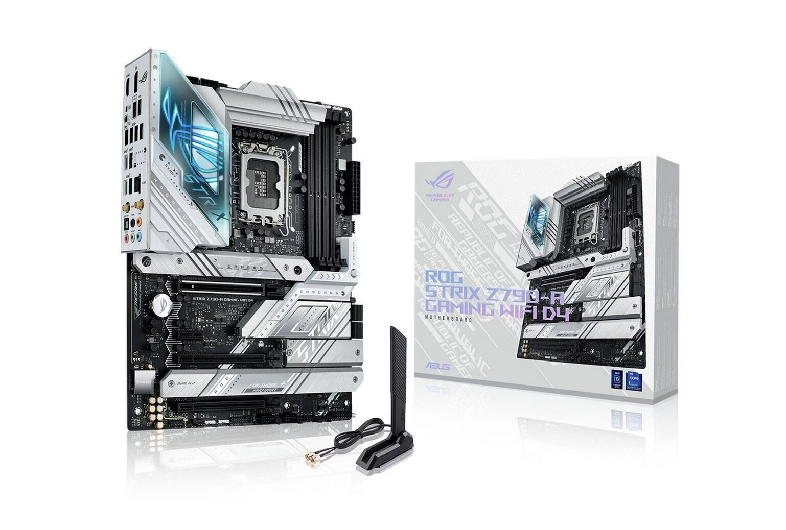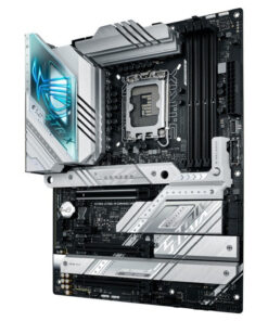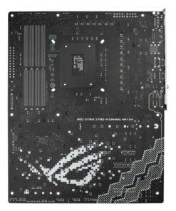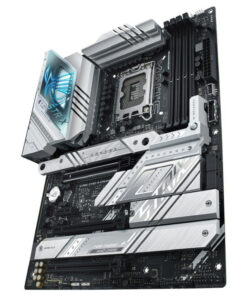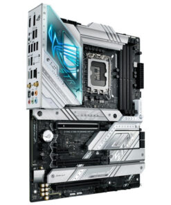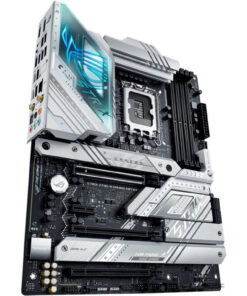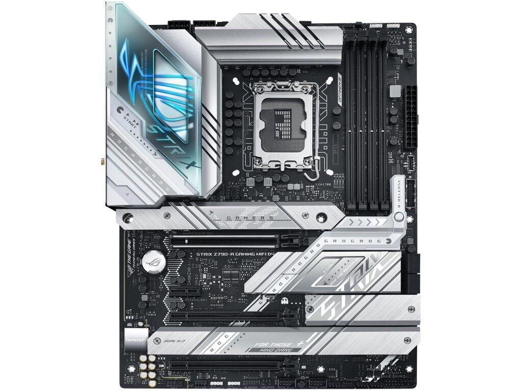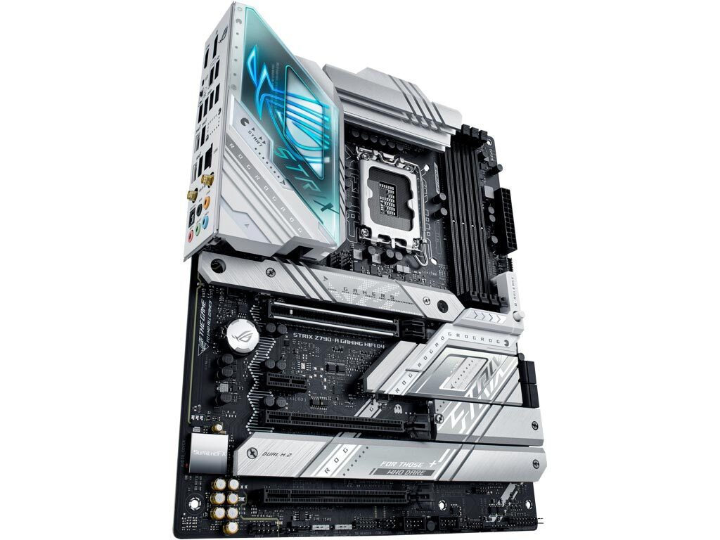 Η ROG Strix Z790-A αγκαλιάζει τολμηρά το φως, για μια εναλλακτική εκδοχή των θεμάτων κατασκευής σε σχέση με τον σκοτεινό και μελαγχολικό αδελφό της, την Strix Z790-F. Οι ασημένιες μεταλλικές ψύκτρες ξεπροβάλλουν σε ένα σκούρο φόντο PCB και εφιστούν την προσοχή στην υψηλή ικανότητα της πλακέτας για θερμική διαχείριση.