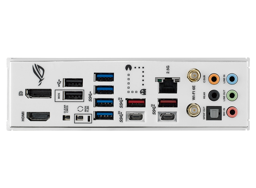 Ένα διαφανές στρώμα στην ασπίδα εισόδου/εξόδου προσθέτει μια μοναδική πινελιά και τονίζει το προσαρμόσιμο λογότυπο RGB από κάτω. Ολόκληρος ο σχεδιασμός δένεται με λεπτομέρειες με επίκεντρο την ROG στην πλακέτα, τις ψύκτρες και την ασπίδα I/O για μια ζωντανή και φουτουριστική εμφάνιση.