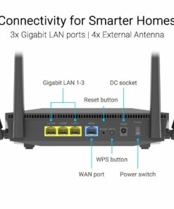 Ο router περιλαμβάνει φυσικές συνδέσεις μέσω θυρών RJ45 και Ethernet LAN, εξασφαλίζοντας αξιόπιστη και σταθερή μετάδοση δεδομένων για συσκευές που απαιτούν ενσύρματη σύνδεση. Περιλαμβάνει το απαραίτητο καλώδιο RJ45 για άμεση σύνδεση με συμβατές συσκευές, απλοποιώντας την εγκατάσταση και τη χρήση.