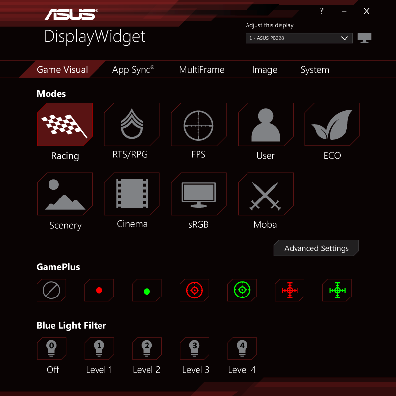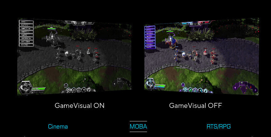 Η τεχνολογία Asus GameVisual διαθέτει επτά προκαθορισμένες λειτουργίες προβολής για τη βελτιστοποίηση των οπτικών για διαφορετικούς τύπους περιεχομένου. Αυτή η μοναδική δυνατότητα είναι εύκολα προσβάσιμη μέσω ενός πλήκτρου πρόσβασης ή του μενού ρυθμίσεων στην οθόνη (OSD).