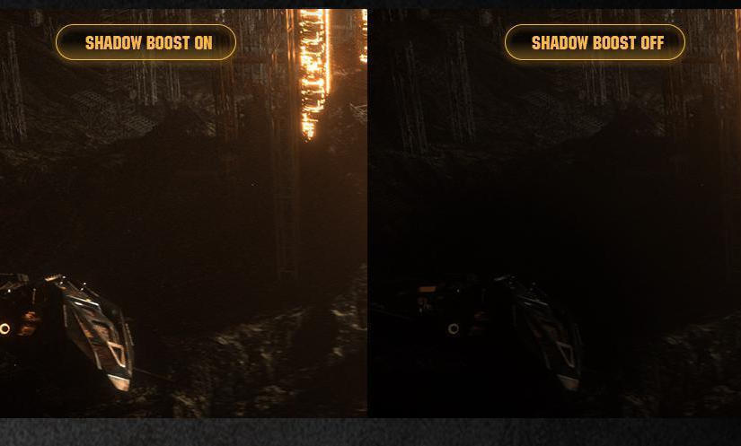 Η τεχνολογία Asus Shadow Boost αποσαφηνίζει τις σκοτεινές περιοχές του παιχνιδιού χωρίς να υπερεκθέτει τις φωτεινότερες περιοχές, βελτιώνοντας τη συνολική προβολή ενώ παράλληλα διευκολύνει τον εντοπισμό εχθρών που κρύβονται σε σκοτεινές περιοχές του χάρτη.