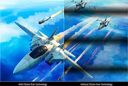 Η τεχνολογία Flicker-Free μειώνει το τρεμόπαιγμα για να σου προσφέρει μια άνετη εμπειρία παιχνιδιού. Αυτό ελαχιστοποιεί την κόπωση των ματιών σου και άλλων δυνητικά επιβλαβών παθήσεων των ματιών σου όταν εμπλέκεσαι σε μεγάλες συνεδρίες παιχνιδιού.