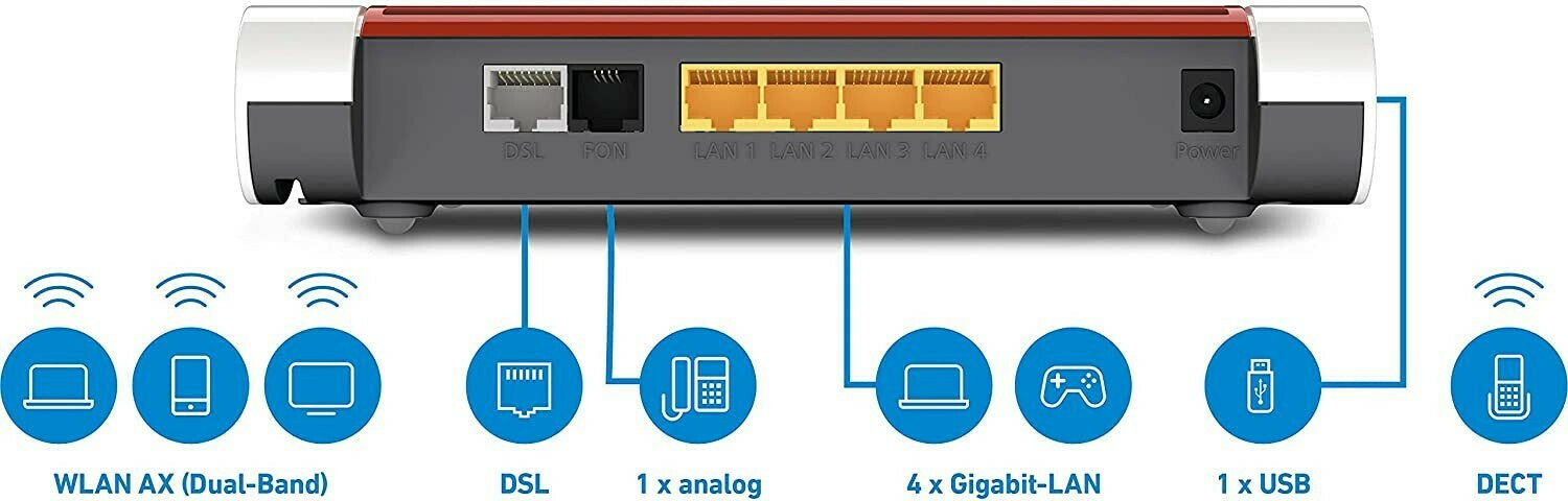 Το FRITZ!Box 7530 AX είναι κατάλληλο για όλες τις συνδέσεις DSL έως 300 Mbit/s. Είτε πρόκειται για ADSL, ADSL2+, VDSL ή 35b supervectoring. Το FRITZ!Box σας εξασφαλίζει τη σύνδεση, πράγμα που σημαίνει ότι μπορείτε να καθίσετε αναπαυτικά και να απολαμβάνετε πρόσβαση στο Internet υψηλής ταχύτητας. Τέσσερις θύρες LAN gigabit και μία θύρα USB προσφέρουν ένα ευρύ φάσμα επιλογών. Σημαίνουν επίσης ότι μπορείτε να ενσωματώσετε τον εκτυπωτή σας στο οικιακό σας δίκτυο και να παρέχετε μέσα αποθήκευσης USB. Αυτό σημαίνει ότι μπορείτε να έχετε πρόσβαση στα βίντεο, τις φωτογραφίες και τη μουσική σας όποτε και όπου θέλετε.