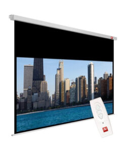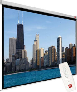 Οθόνη Avtek Video Electric 300P με λευκό μεταλλικό περίβλημα για τοίχο ή οροφή. Η επίπεδη βάση του περιβλήματος επιτρέπει την ενσωμάτωσή του σε ψευδοροφή.