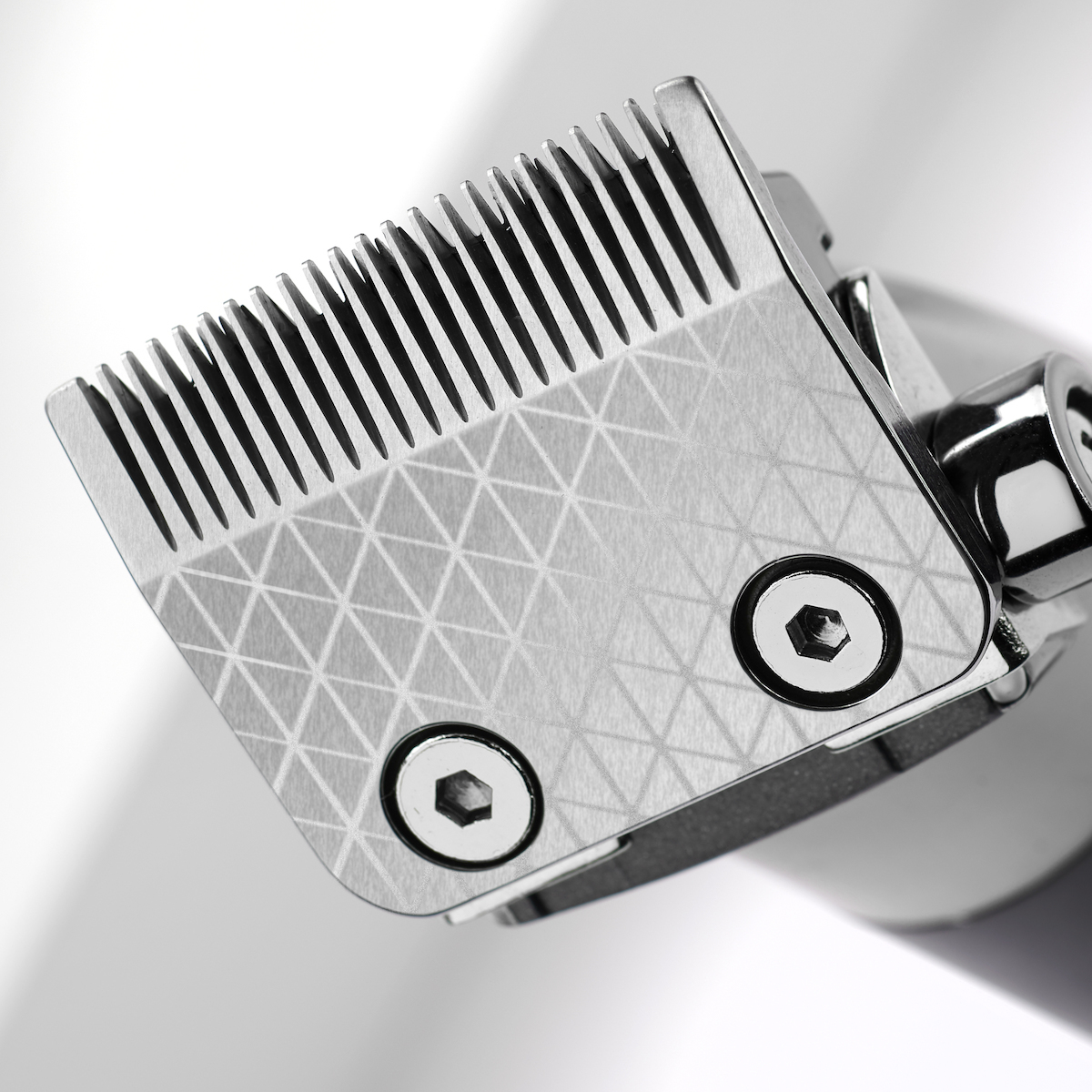 Μεταλλική κουρευτική μηχανή με προηγμένες λεπίδες από ιαπωνικό ατσάλι που προσφέρουν εξαιρετική απόδοση και επαγγελματικά αποτελέσματα.