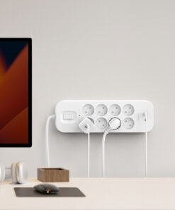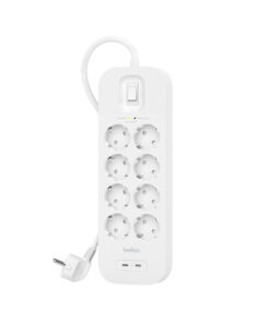 Πολύπριζο Belkin SurgePlus με 8 υποδοχές schuko και 2 θύρες USB-C. Προστασία υπερτάσης με μέγιστη ενέργεια 900J. Το καλώδιο έχει μήκος 2 μέτρων και το χρώμα του είναι λευκό.