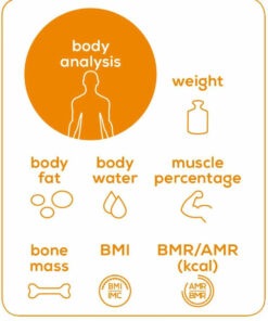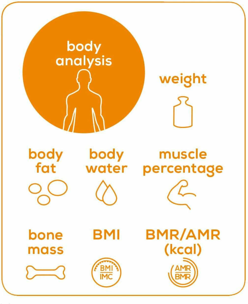 - Προσδιορισμός σωματικού βάρους, σωματικού λίπους, υγρών του σώματος, ποσοστού μυών, οστικής μάζας, Ενεργού μεταβολικού ρυθμού (AMR) / Βασικού μεταβολικού ρυθμού ( BMR) και Δείκτη μάζας σώματος (BMI)