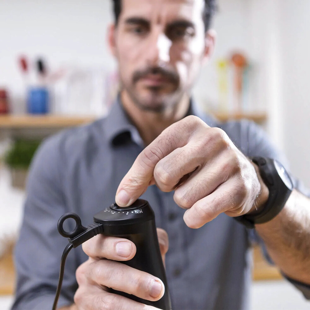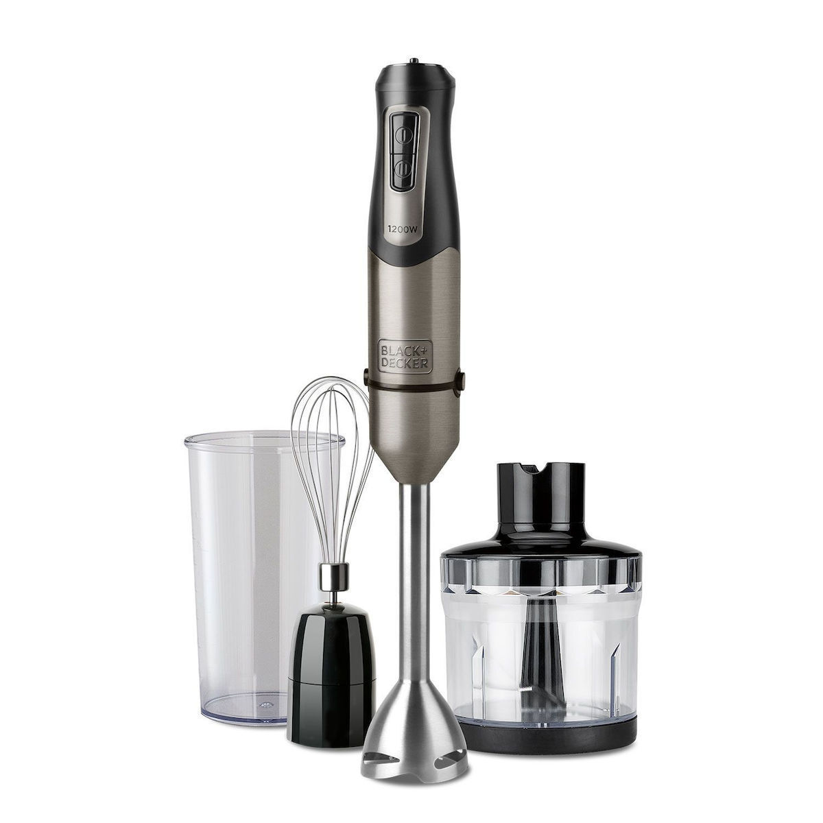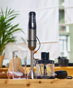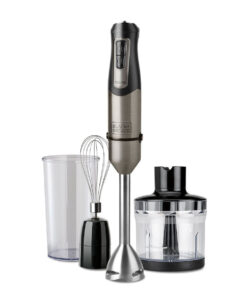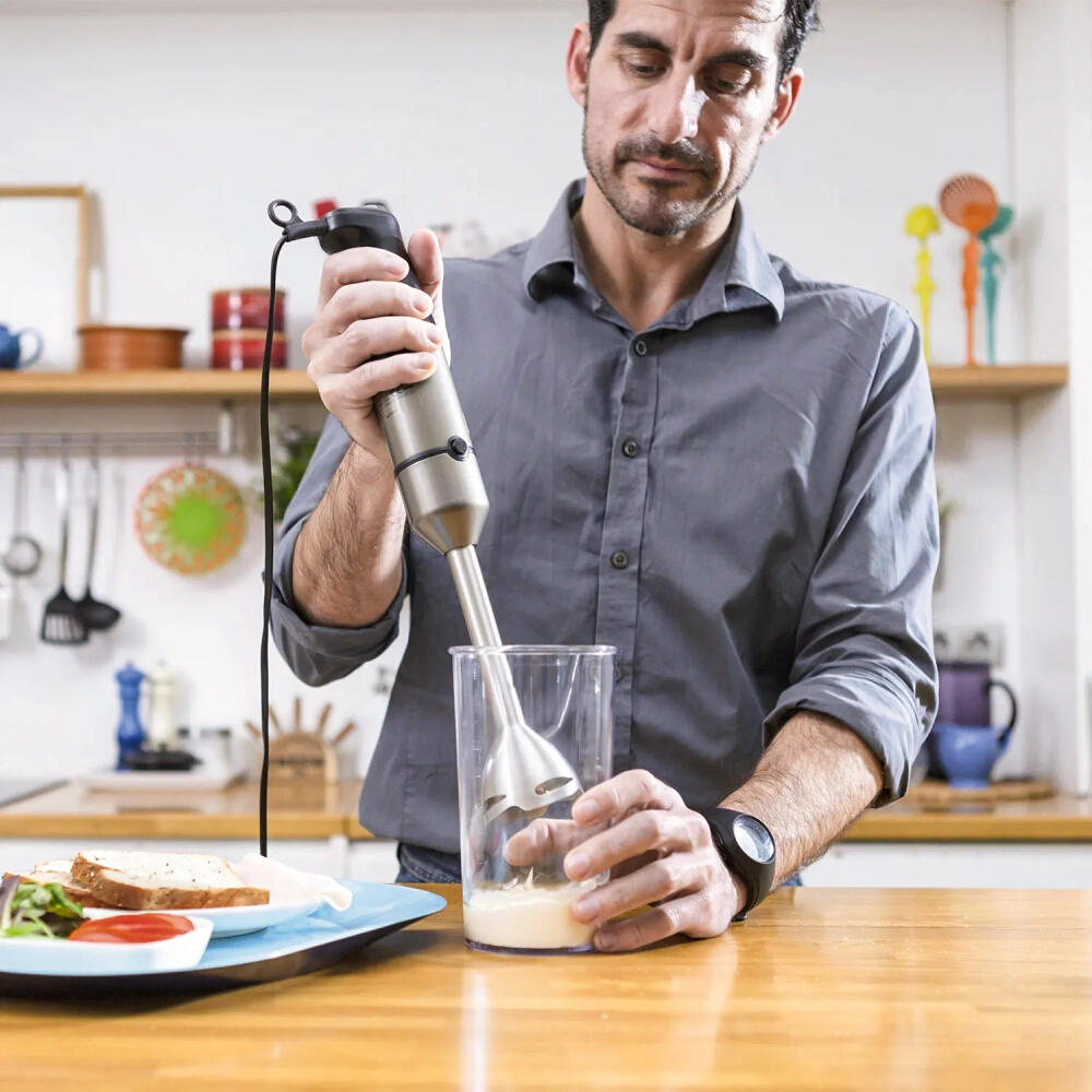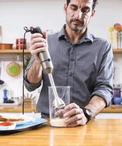 Ραβδομπλέντερ, της εταιρείας Black & Decker, με ισχύ 1200 Watt. Με το ραβδομπλέντερ θα μπορέσετε να πολτοποιήσετε τρόφιμα για παιδικές τροφές, να ομογενοποιήσετε σάλτσες, να φτιάξετε σπιτική μαγιονέζα, να δημιουργήσετε smoothies από οποιοδήποτε φρούτο επιθυμείτε ή ακόμα και να ετοιμάσετε σούπες. Είναι πολύ πρακτικό, εύχρηστο και καταλαμβάνει λιγότερο χώρο, σε σχέση με ένα επιτραπέζιο μπλέντερ. Μεγάλο του πλεονέκτημα αποτελεί το γεγονός ότι μπορείτε να επεξεργάζεστε τα υλικά σας μέσα σε οποιοδήποτε σκεύος, χωρίς να χρειάζεται να τα μεταφέρετε και να συσσωρεύονται στην κουζίνα σας διαρκώς άπλυτα σκεύη. Κατά τη διάρκεια του μαγειρέματος καλό θα είναι να έχετε πάντα την κεφαλή βυθισμένη μέσα στα τρόφιμα που επεξεργάζεστε, ώστε να αποφεύγονται ανεπιθύμητα πιτσιλίσματα αλλά και τυχόν εγκαύματα, στην περίπτωση που το τρόφιμο που επεξεργάζεστε είναι ακόμα καυτό.