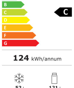 Σύμφωνα με την νέα κλίμακα ενεργειακής απόδοσης, ο ψυγειοκαταψύκτης ανήκει στην ενεργειακή κλάση C, ενώ η ετήσια κατανάλωση ενέργειας φτάνει τις 124 kWh/y, διαθέτοντας έτσι έναν οικονομικό σχεδιασμό. Η αναστρέψιμη πόρτα προσφέρει ακόμα μεγαλύτερη ευκολία στη χρήση, επιτρέποντας ανοίγματα από αριστερά ή δεξιά ανάλογα με τις ανάγκες σας.