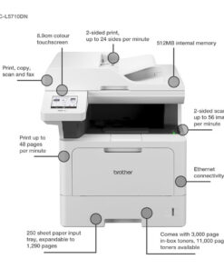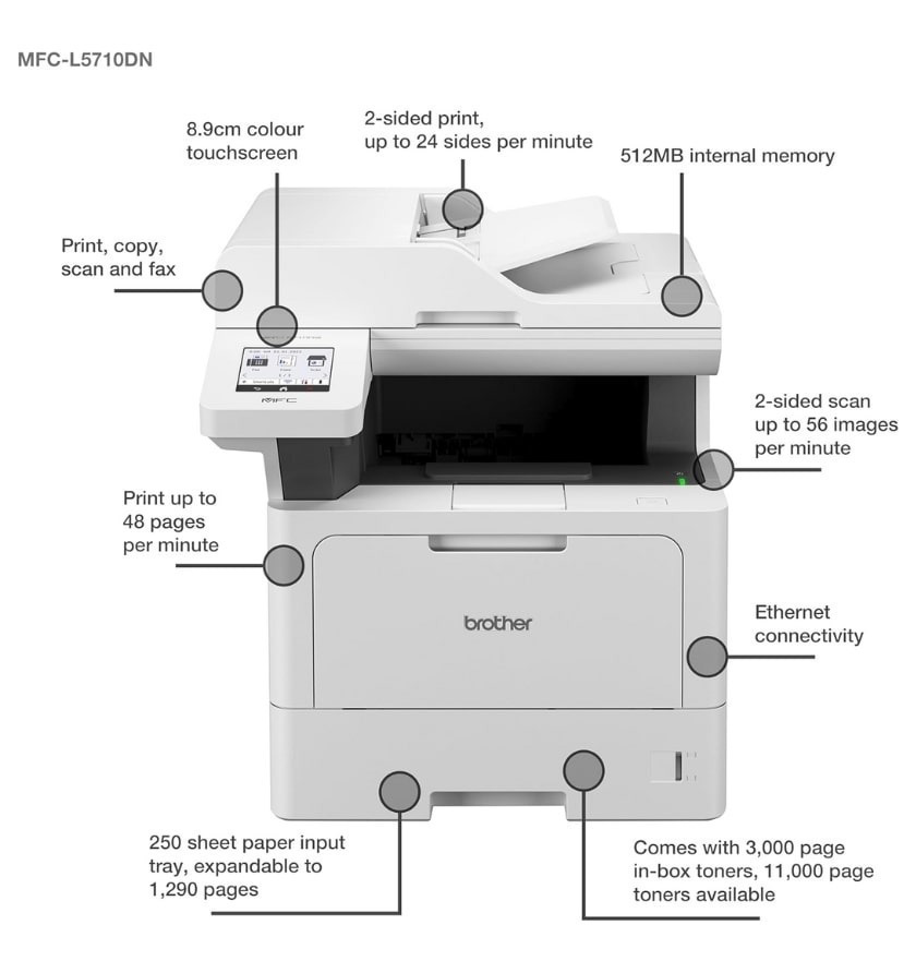 Με το πολυμηχάνημα MFC-L5710DN της Brother θα μπορέσετε να κάνετε τα πάντα, όπως εκτύπωση, σάρωση και αντιγραφή. Χρησιμοποιεί τεχνολογία laser και μπορεί να τυπώσει μόνο ασπρόμαυρα. Μέσω καλωδίου ethernet έχει τη δυνατότητα να συνδεθεί στο δίκτυό σας και έτσι να μπορέσετε να εκτυπώσετε από όποιονδήποτε υπολογιστή από απόσταση, χωρίς να χρειάζεται η σύνδεση μέσω καλωδίου USB.