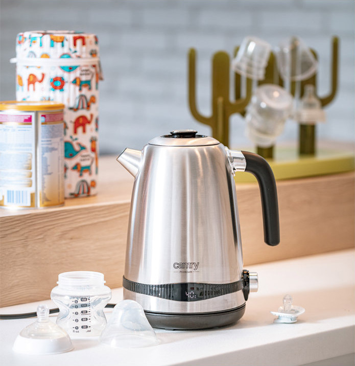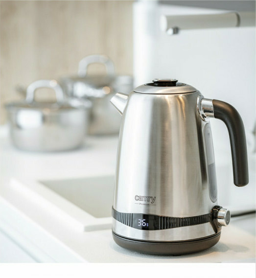O ηλεκτρικός βραστήρας, από την εταιρεία Camry, είναι κατασκευασμένος από ανοξείδωτο ατσάλι υψηλής ποιότητας, εξοπλισμένος με φίλτρο κατά των αλάτων και προστασία από την υπερθέρμανση. Διαθέτει οθόνη για τη ρύθμιση της θερμοκρασίας σε 7 επίπεδα από 40 – 100 °C, καθώς και τη διατήρηση της θερμοκρασίας στα ίδια επίπεδα θερμοκρασίας. Στη λειτουργία διατήρησης θερμοκρασίας, η οθόνη LCD δείχνει μόνιμα επιλεγμένο το επίπεδο θερμοκρασίας ενώ θερμαίνει το νερό κυκλικά για 2 ώρες.