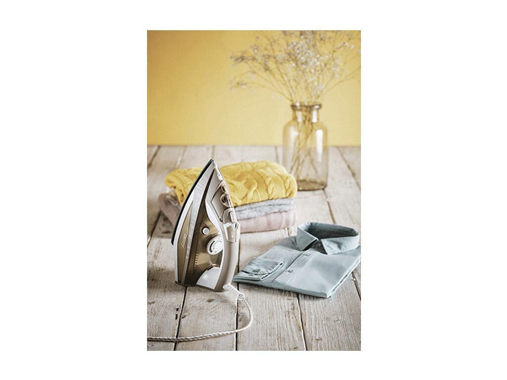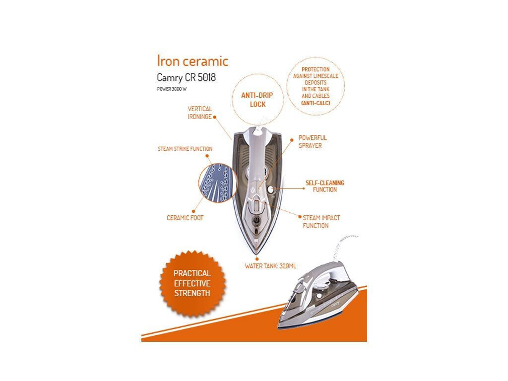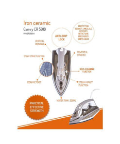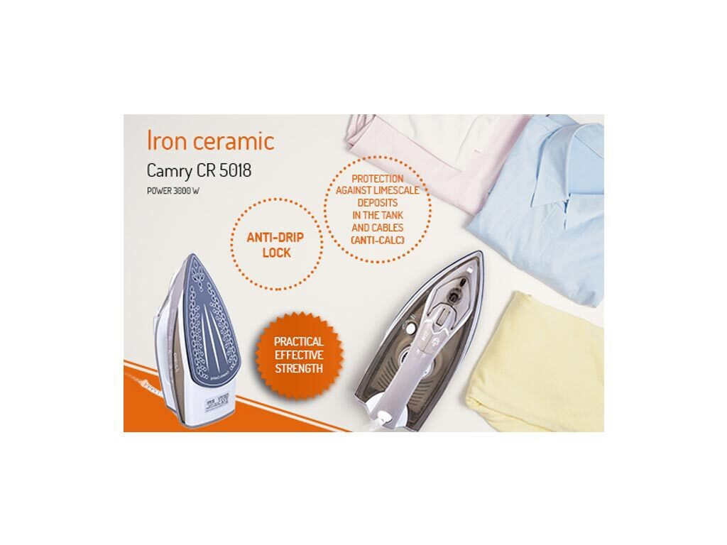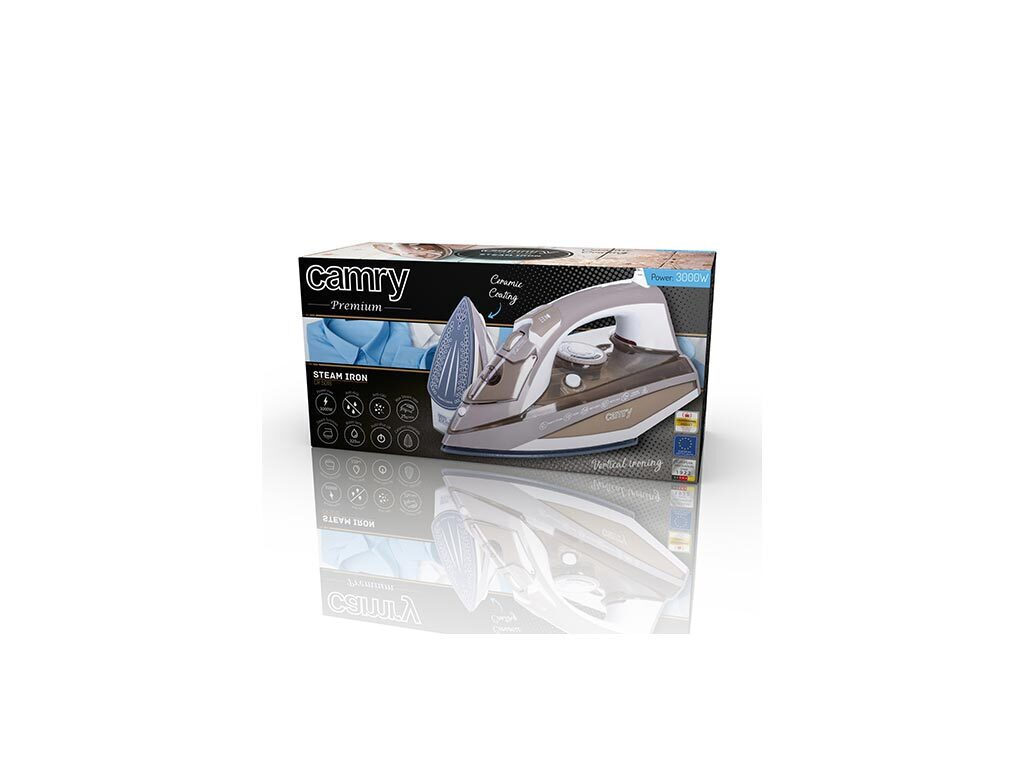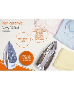 Σίδερο ατμού, από την εταιρεία Camry, με ισχύ 3000W. Χάρη στο κράμα κεραμικής, μετακινείται εύκολα πάνω στην επιφάνεια του υλικού, γεγονός που αυξάνει την άνεση του ατόμου σιδερώματος. Η χρήση ισχυρού ατμού επιτρέπει να απαλλαγείτε από τις πιο επίμονες τσακίσεις. Για λόγους ασφαλείας, το σίδερο είναι εξοπλισμένο με αυτόματο σύστημα απενεργοποίησης. Επιπλέον, έχει μια χρήσιμη λειτουργία αυτοκαθαρισμού και ένα στοπ στάγδην.