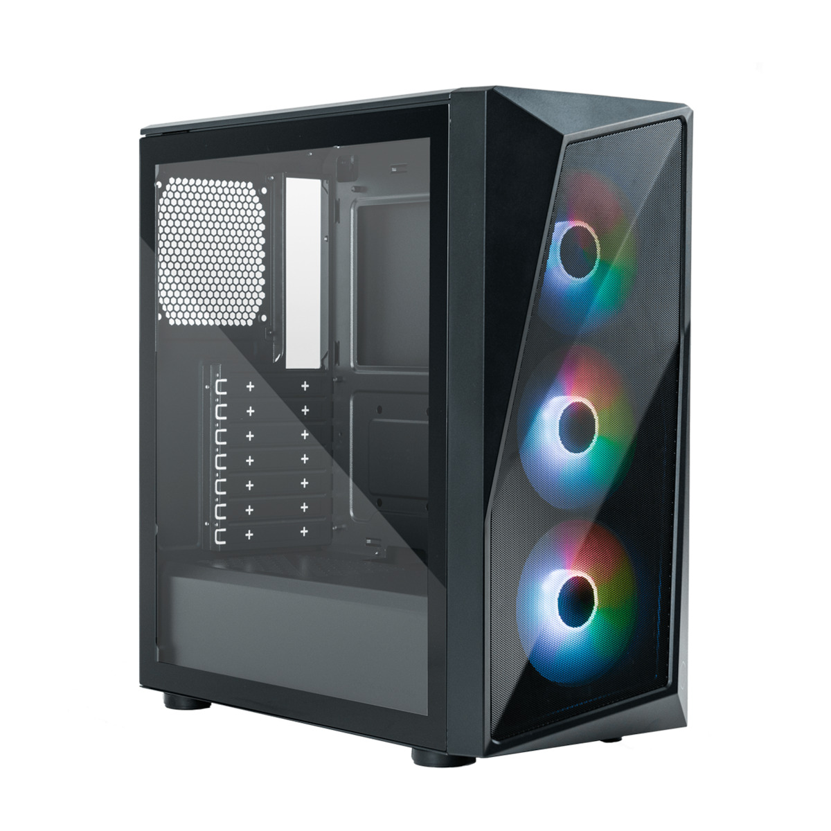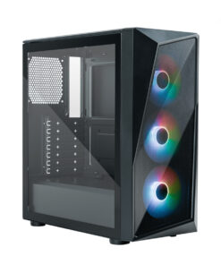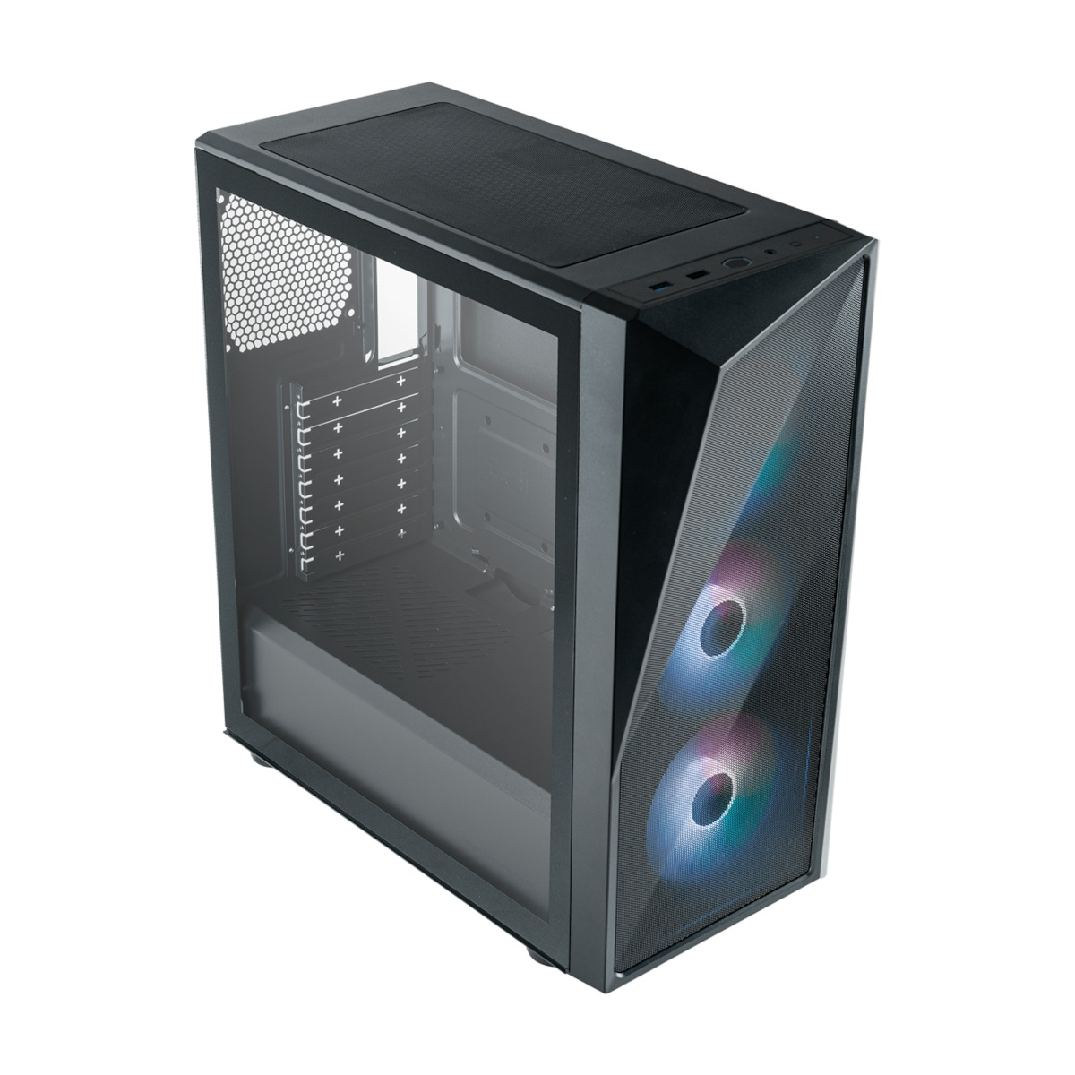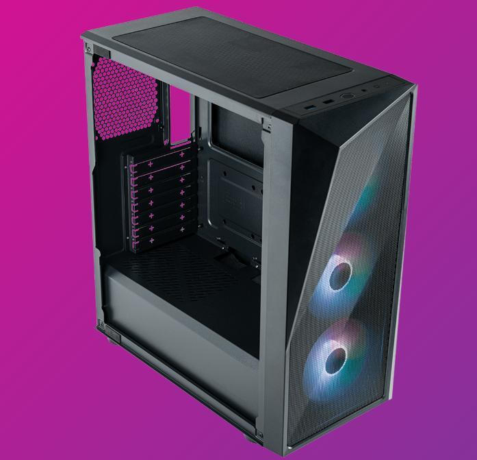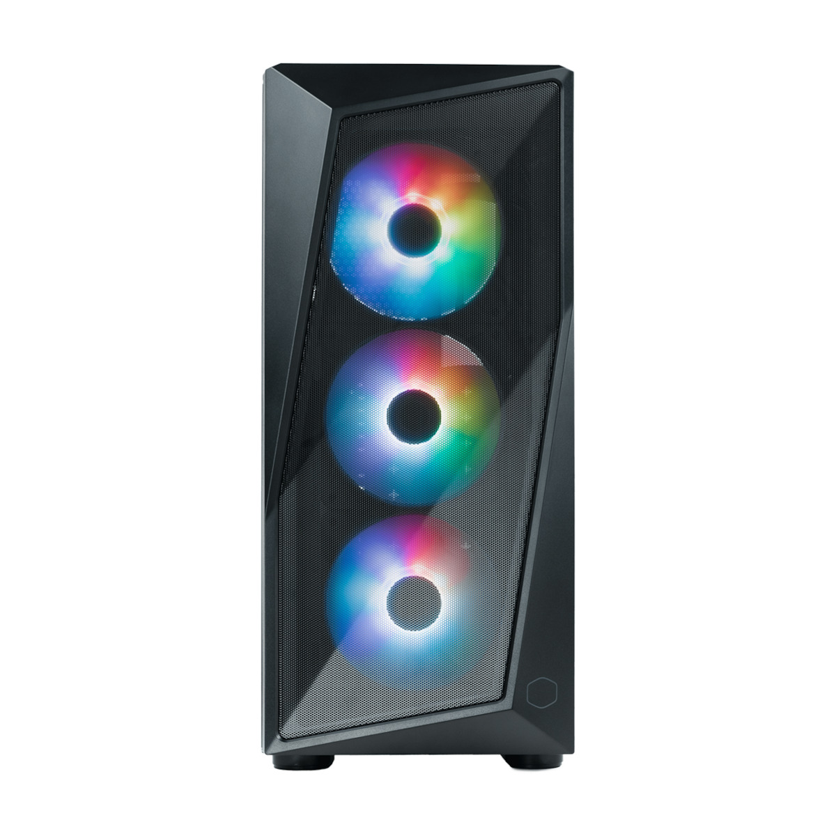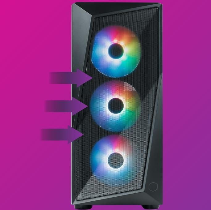 Η ασύμμετρη σχεδίαση του μπροστινού πάνελ της CMP 520 πλαισιώνει τους τρεις προεγκατεστημένους ανεμιστήρες ARGB 120 mm ως μοναδικά κεντρικά στοιχεία στην κατασκευή.