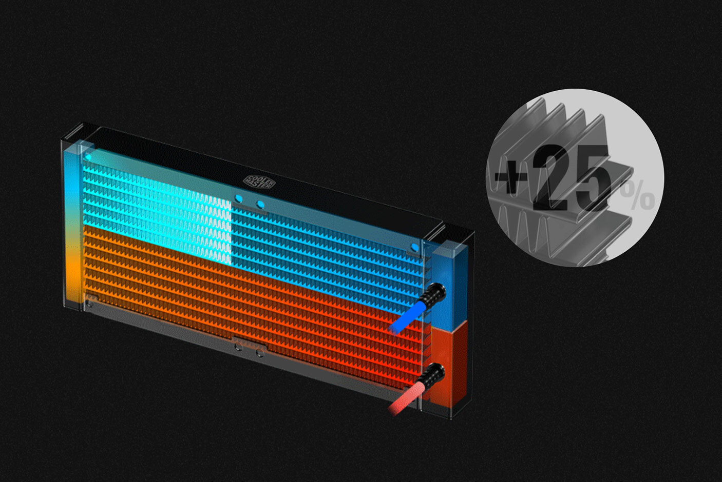 Όσο μεγαλύτερη είναι η επιφάνεια τόσο καλύτερη και ταχύτερη είναι η απομάκρυνση της θερμότητας. Για καλύτερη απόδοση ψύξης, η Cooler Master αύξησε την επιφάνεια του ψυγείου κατά 25% σε σύγκριση με το παρελθόν ή σε σύγκριση με άλλες λύσεις.