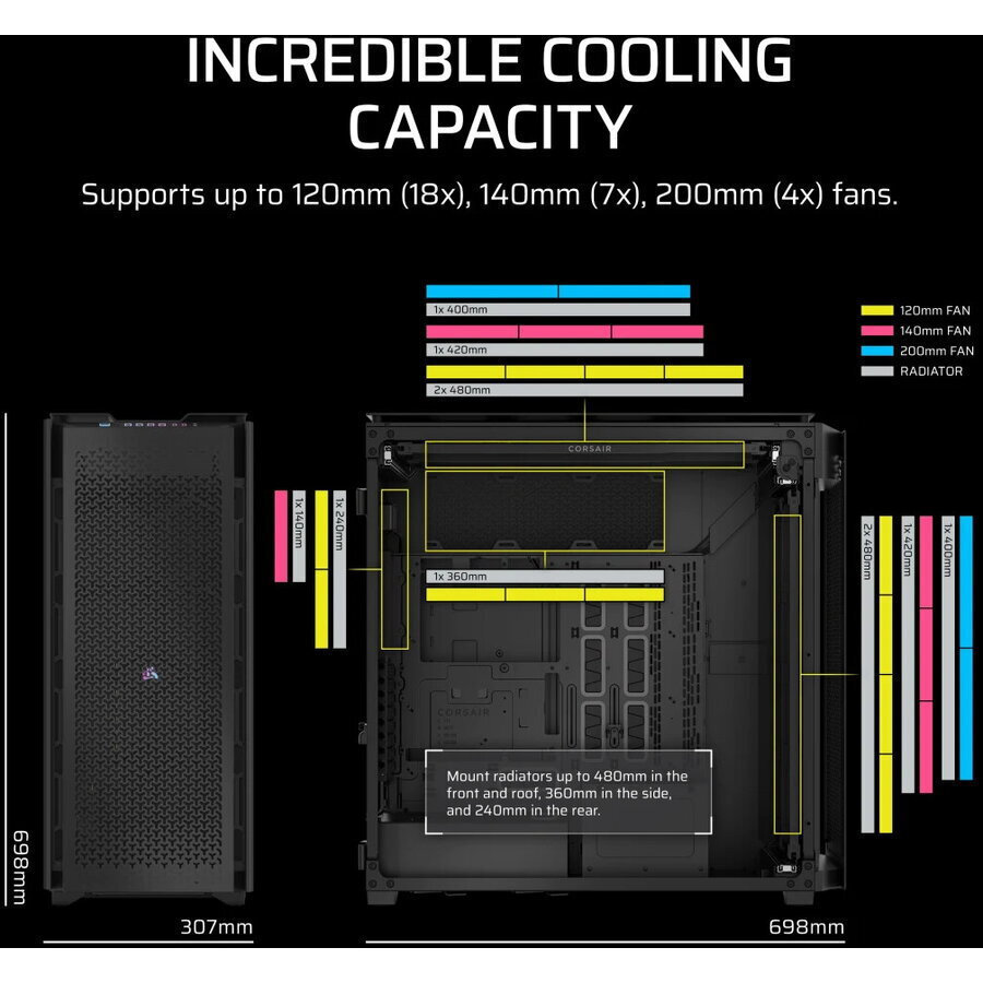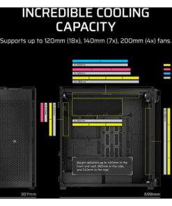 Ένα σπηλαιώδες εσωτερικό υποστηρίζει ένα ευρύ φάσμα διαμορφώσεων ψύξης, φιλοξενώντας έως και 18x 120mm, 7x 140mm ή 4x 200mm ανεμιστήρες. Τοποθετήστε θερμαντικά σώματα έως και 480mm στο μπροστινό μέρος και στην οροφή, 360mm στο πλάι και 240mm στο πίσω μέρος για απαράμιλλους προσαρμοσμένους βρόχους ψύξης.