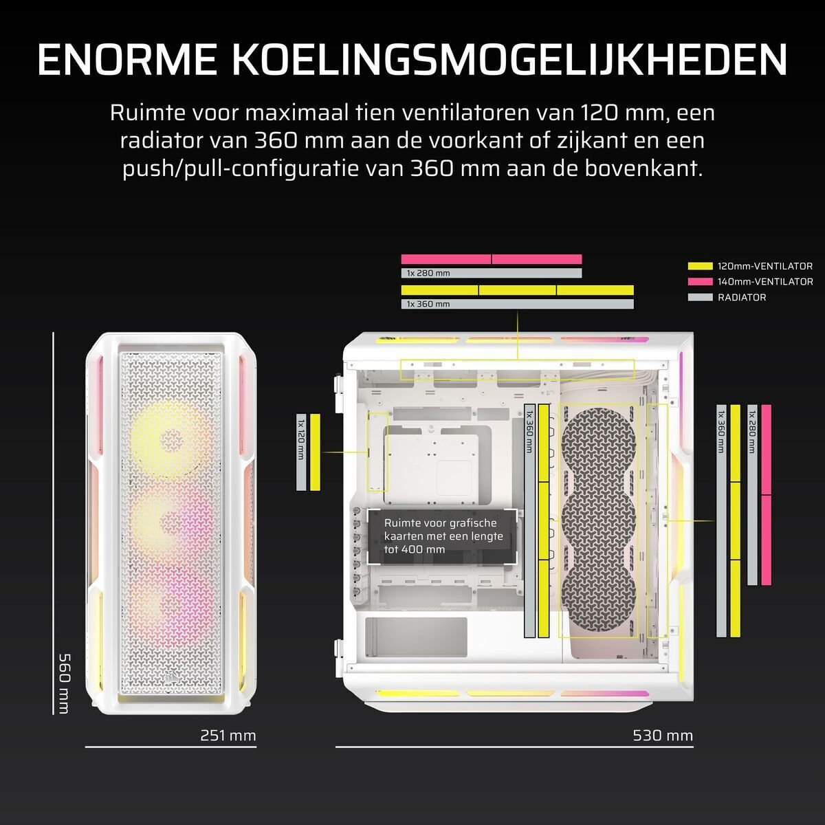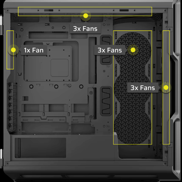 Το ευρύχωρο εσωτερικό φιλοξενεί έως και 10x ανεμιστήρες 120mm ή 4x 140mm, καθώς και πολλαπλά ψυγεία πάχους 60mm, συμπεριλαμβανομένων έως και 360mm μπροστά ή στο πλάι και 360mm push/pull στην οροφή.