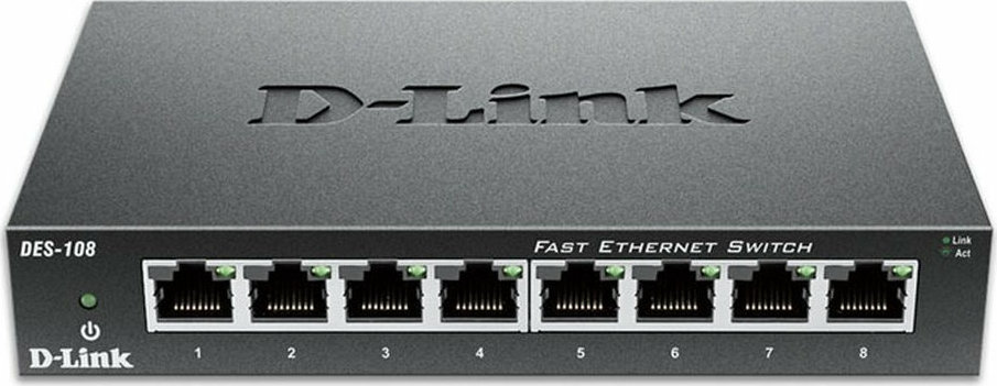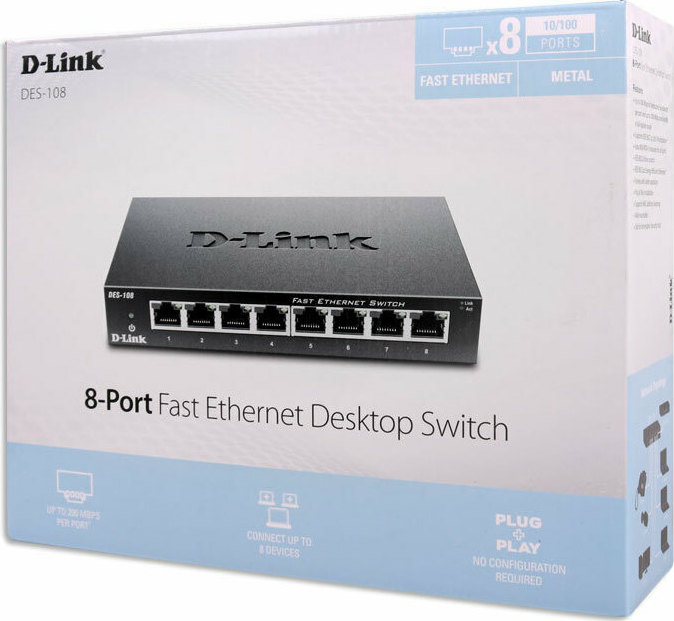 Το DES-108 Fast Ethernet switch της D-Link αποτελεί έναν οικονομικό και αποδοτικό τρόπο για τη δημιουργία ενός μικρού δικτύου. Διαθέτει 8 θύρες Fast Ethernet με αυτόματη λειτουργία ανίχνευσης της μέγιστης ταχύτητας των συνδεδεμένων συσκευών.