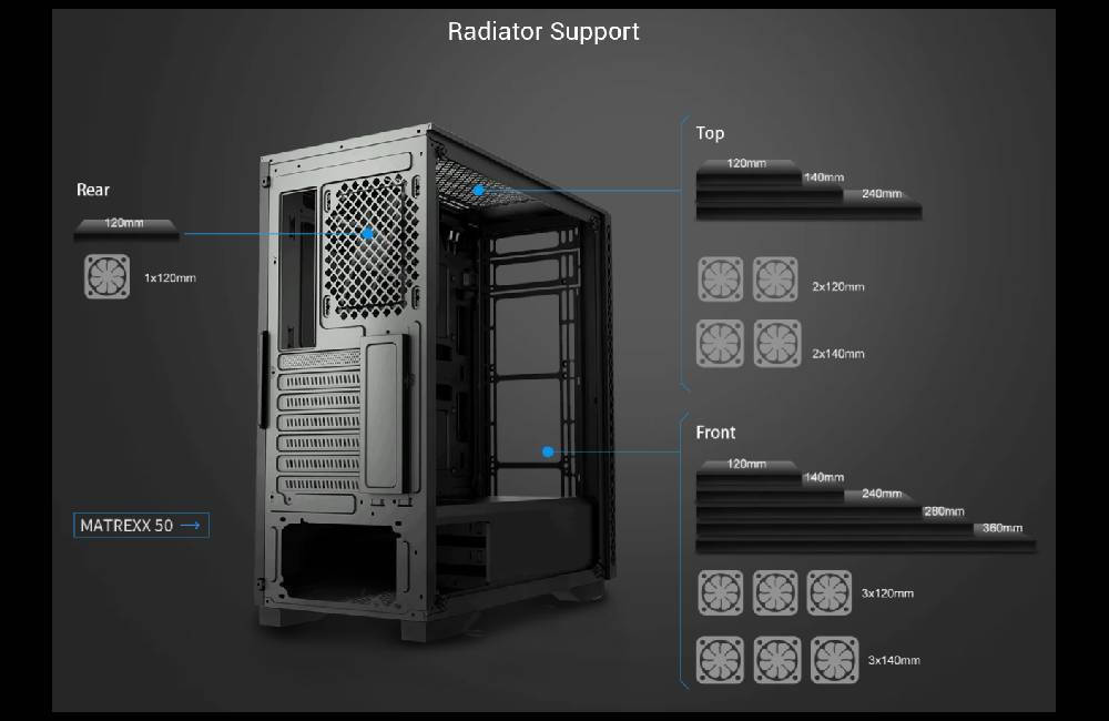 Ως mid-tower θήκη, η Matrexx 50 διαθέτει άφθονο χώρο που υποστηρίζει μητρικές κάρτες έως και E-ATX. Με δύο μεγάλες εισαγωγές αέρα και μια εξαγωγή αέρα, η βελτιστοποιημένη ροή αέρα είναι εγγυημένη για να διατηρούνται τα εξαρτήματά σας δροσερά. Το Matrexx 50 σας προσφέρει εξαιρετικές εμπειρίες κατασκευής και χρήσης