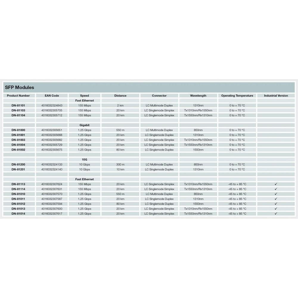 DIGITUS® Mini GBIC. Οι μονάδες πομποδέκτη (SFP) προσφέρουν την υψηλότερη ποιότητα και αξιοπιστία. Ιδανικές για σύνδεση από διακόπτη σε διακόπτη, μετατροπέα σε διακόπτη, μετατροπέα σε μετατροπέα και σε πολλές άλλες εφαρμογές. Η μεγάλη ποικιλία μονάδων DIGITUS® επιτρέπει την ευέλικτη χρήση της τεχνολογίας οπτικών ινών. Η συμμόρφωση με το πρότυπο MSA (Multi Source Agreement) διασφαλίζει τη συμβατότητα με εξωτερικούς κατασκευαστές.