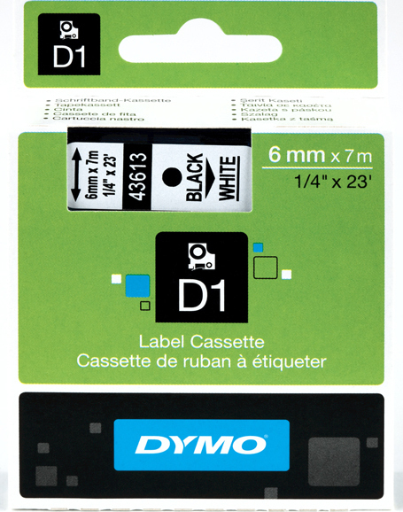 Ετικέτες Dymo D1 S0720780, με τεχνολογία θερμικής μεταφοράς, συσκευασμένες σε πρακτικές κασέτες. Τοποθετήστε τις στον εκτυπωτή και ξεκινήστε τη σηματοδότηση. Δεν απαιτείται μελάνι ή τόνερ.