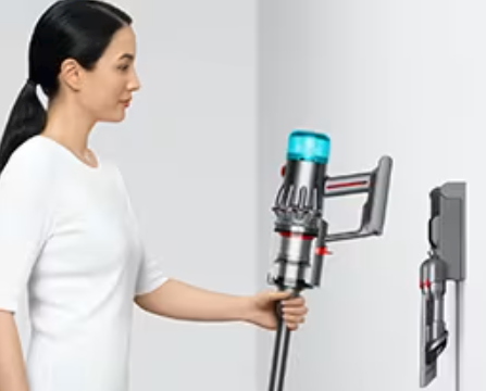 Η Dyson V12 Origin στέκεται πάντα έτοιμη στη βάση της στον τοίχο και φορτίζει, χωρίς να σου πιάνει χώρο.