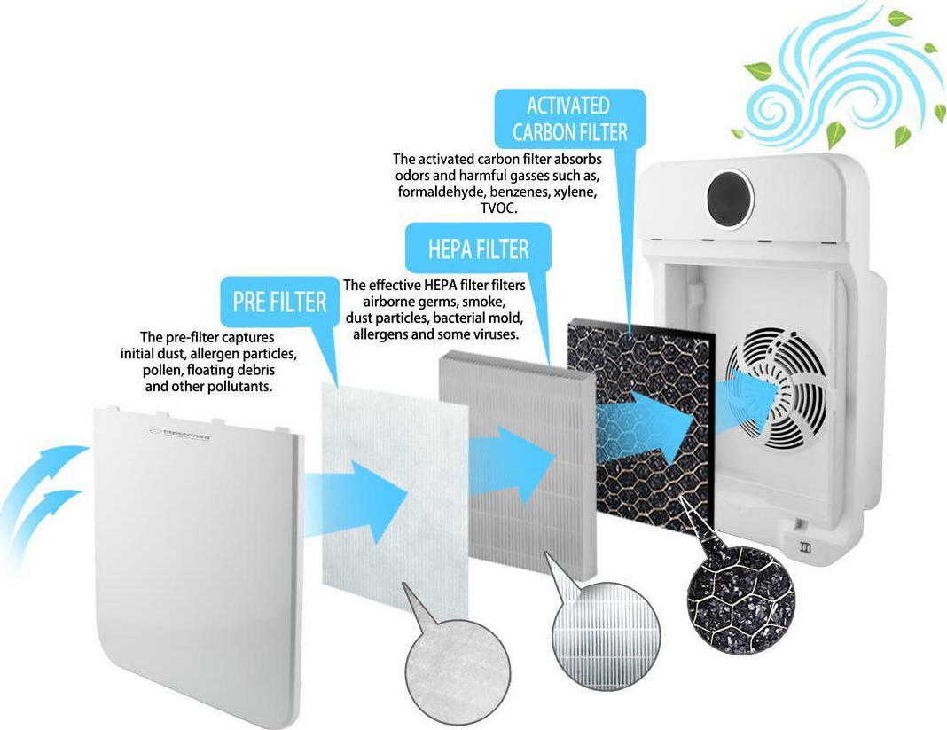 Ο ιονιστής – καθαριστής αέρα, από την εταιρία Esperanza, χάρη στο πρωτοποριακό και προηγμένο φίλτρο 3 σταδίων, σταματά μέχρι 99.97% των ατμοσφαιρικών ρύπων, όπως αλλεργιογόνα, γύρη, σκόνη και αιωρούμενα σωματίδια.