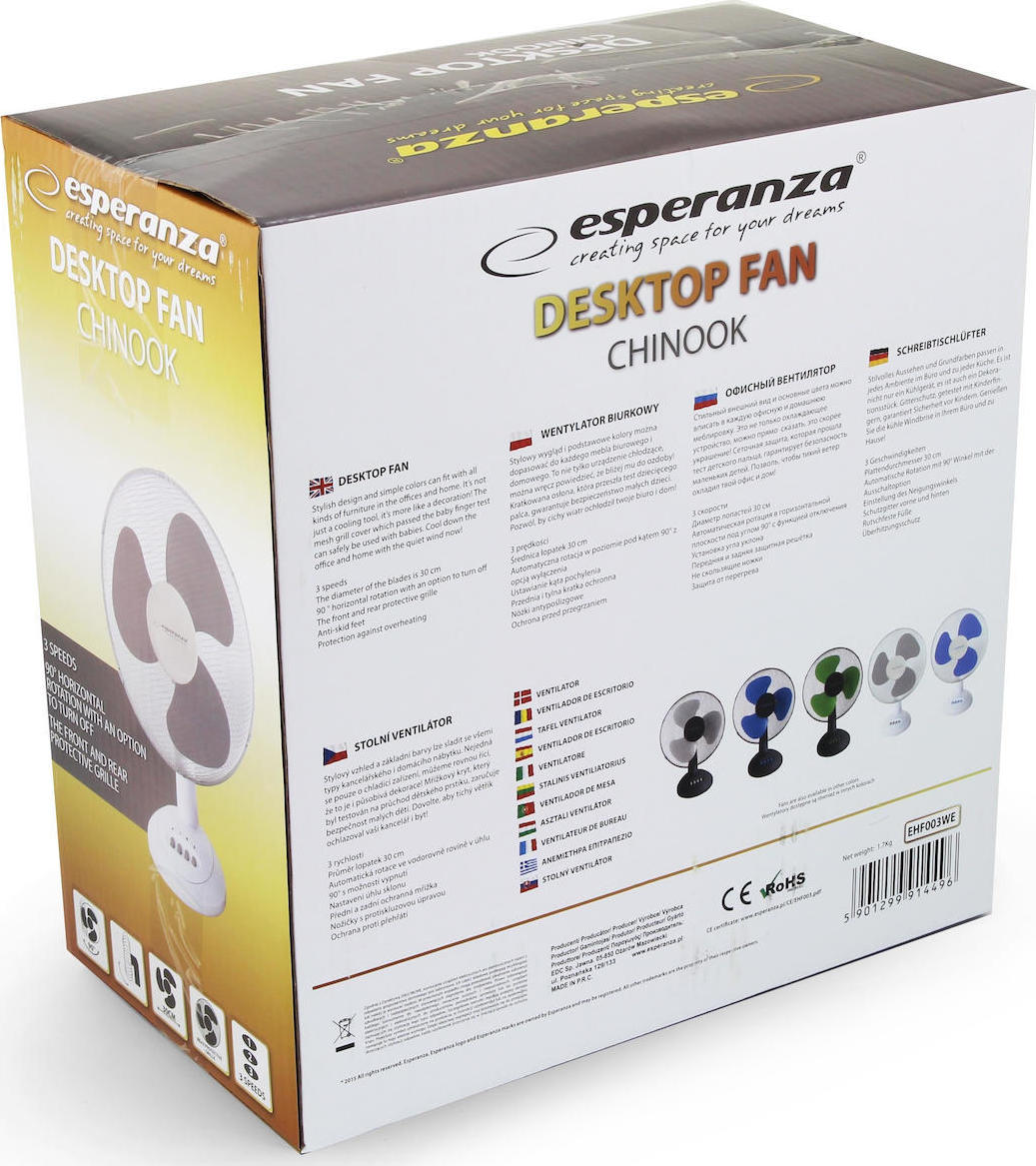 Ανεμιστήρας γραφείου Esperanza CHINOOK με κομψό σχέδιο και απλά χρώματα. Είναι συμβατός με όλα τα είδη επίπλων στο γραφείο και το σπίτι. Δεν είναι απλά ένα εργαλείο ψύξης – είναι και μία διακοσμητική επιλογή!