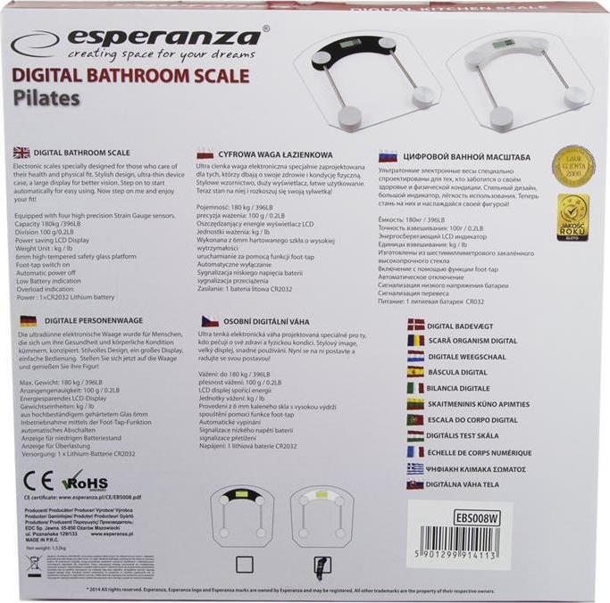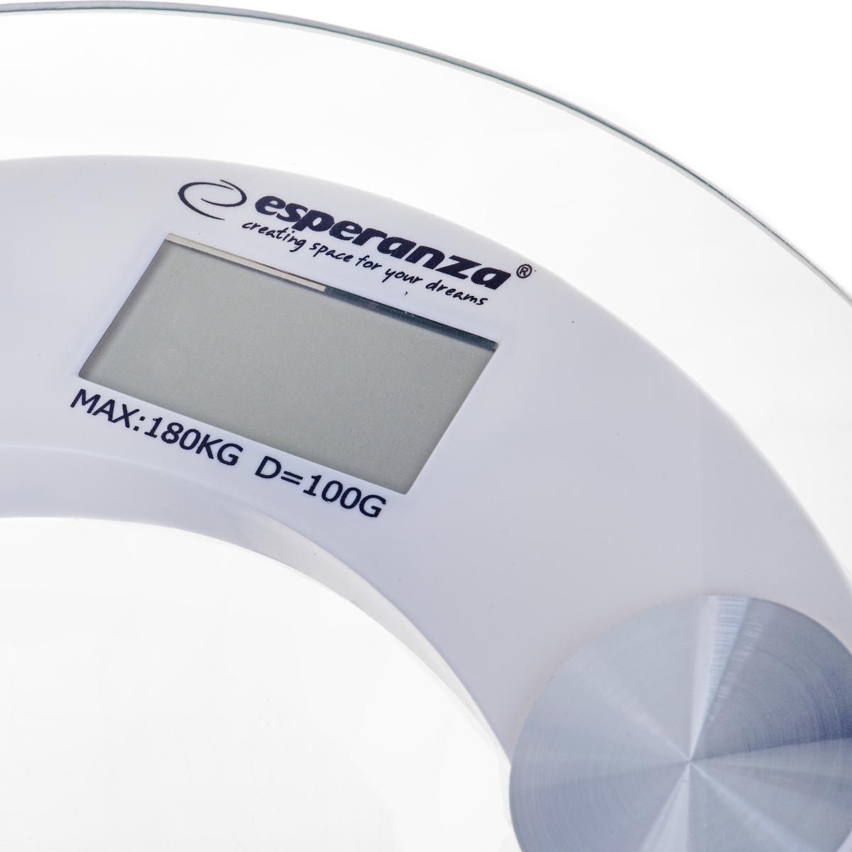 Η ζυγαριά Esperanza EBS008K White είναι εξοπλισμένη με οθόνη LCD, διαθέτει σύστημα αυτόματης ενεργοποίησης και απενεργοποίησης και αντέχει σε βάρος έως και 180 Kg. Περιλαμβάνει ένδειξη χαμηλής μπαταρίας και υπερφόρτωσης.
