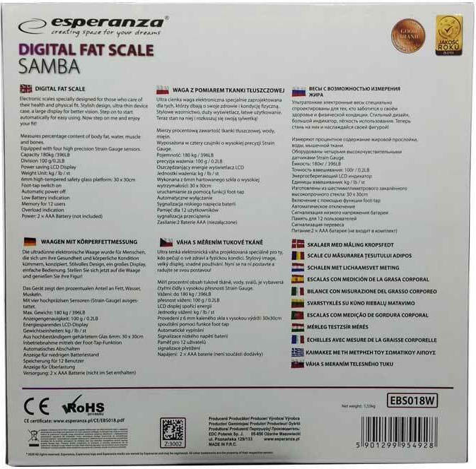 Ψηφιακή ζυγαριά λιπομετρητής της Esperanza με μοντέρνο σχεδιασμό και ποιοτική κατασκευή.