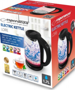 Ο βραστήρας Esperanza EKK027 διαθέτει δυνατή ισχύ 2200 W, έχει κανάτα από πυρίμαχο γυαλί χωρητικότητας 1.7 lt, δείκτη στάθμης νερού με πολύχρωμο φωτισμό LED κατά τη διάρκεια βρασμού (5 διαφορετικά χρώματα ανάλογα με την θερμοκρασία του νερού), προστασία από την υπερθέρμανση και σβήνει αυτόματα όταν βράσει το νερό.