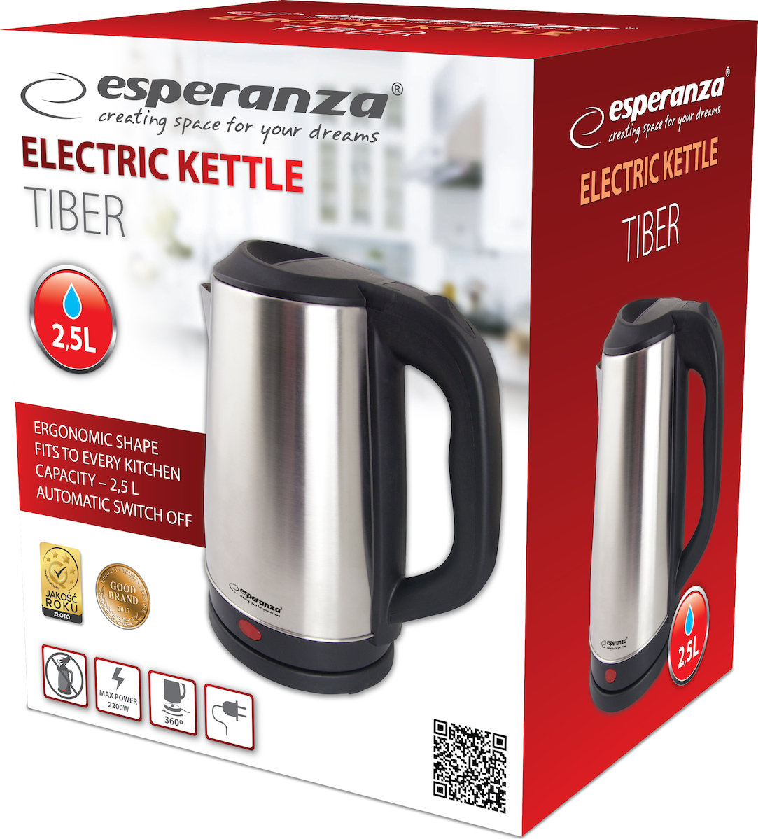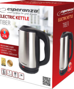 Μοντέρνος και κομψός βραστήρας από ανοξείδωτο ατσάλι Esperanza TIBER, διαθέσιμος σε δύο εκδόσεις φινιρίσματος: βουρτσισμένος και γυαλιστερός, ώστε να ταιριάζει σε οποιαδήποτε κουζίνα.