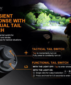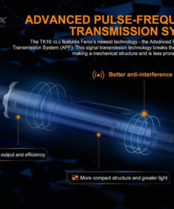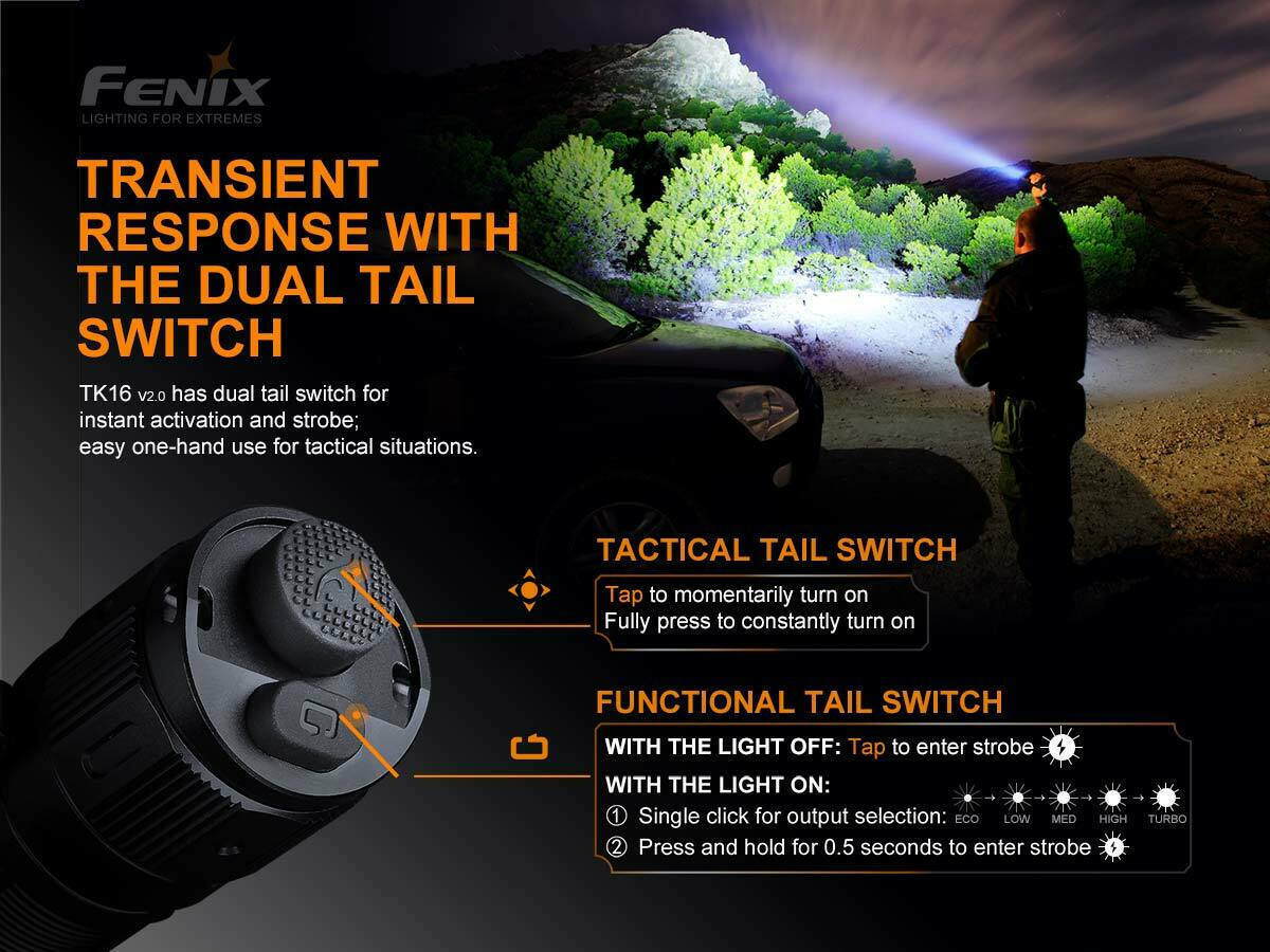 Το μοναδικό APF (Προηγμένο σύστημα μετάδοσης παλμών-συχνότητας) της Fenix καθιστά πιο συμπαγή τη δομή και την τακτική ικανότητα. Το TK16 V2.0 διαθέτει διπλό τακτικό διακόπτη ουράς για άμεση ενεργοποίηση και στροβοσκοπική λειτουργία. Εύκολη χρήση με το ένα χέρι για τακτικές καταστάσεις. Το συμπαγές σώμα με στεφάνη χτυπήματος από ανοξείδωτο χάλυβα είναι ιδανικός σχεδιασμός για ασφάλεια και άμυνα.