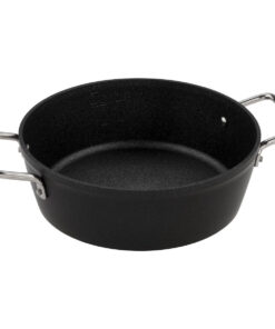 Διαστάσεις τηγανιού 24 εκ.: Όγκος: 4.9 λίτρα, Ύψος: 120 mm, Σχήμα: Κωνικό, Υλικό: αλουμίνιο με λαβές από ανοξείδωτο χάλυβα 18/10, Διάμετρος βάσης: 21.5 εκ., Διάμετρος άνω: 24 εκ., Μέγιστη θερμοκρασία: 180 βαθμοί, Αντικολλητική επιφάνεια εσωτερικά.
