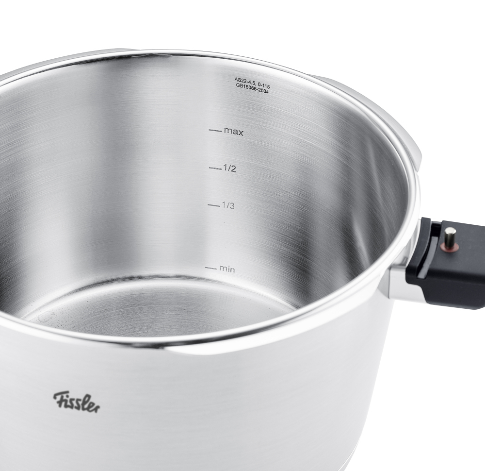 Η χύτρα Fissler διαθέτει ενδείξεις min και max για να υπολογίζεις με ακρίβεια την απαραίτητη ποσότητα υγρών κατά το μαγείρεμα