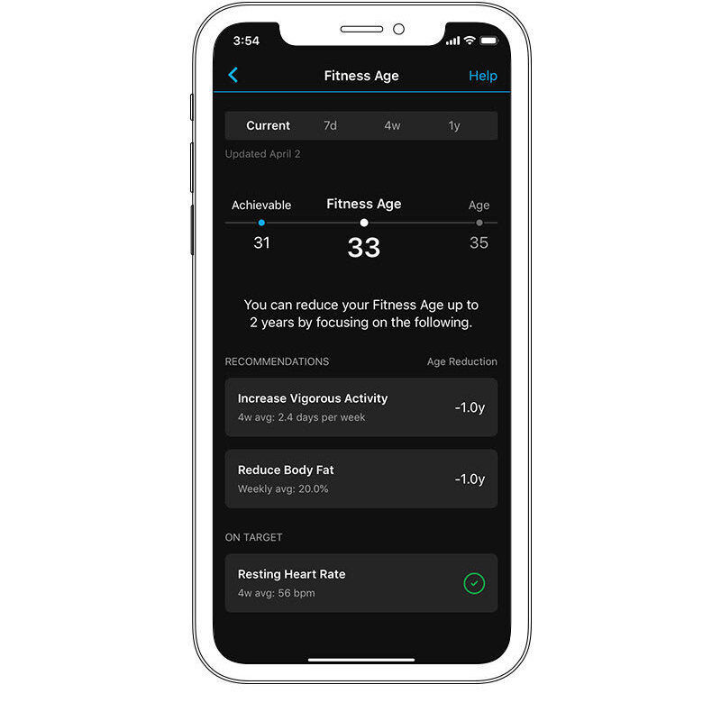 Αυτή η λειτουργία χρησιμοποιεί την χρονολογική ηλικία σας, την έντονη εβδομαδιαία δραστηριότητα σας, τους καρδιακούς παλμούς κατά την ανάπαυση και το ΒΜΙ σας για να σας δώσει μια εκτίμηση εάν το σώμα σας είναι νεότερο ή μεγαλύτερο από ότι εσείς. Δείτε συμβουλές για το πως να μειώσετε την ηλικία της φυσικής σας κατάστασης.