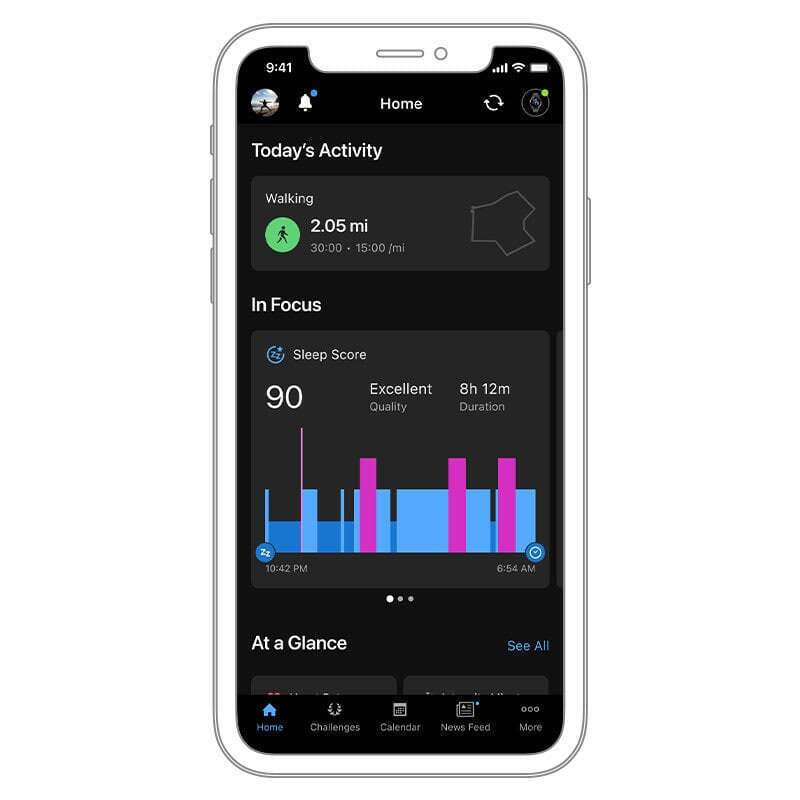 Λάβετε μια βαθμολογία της ποιότητας του ύπνου σας και λεπτομέρειες για το τι μπορείτε να κάνετε καλύτερα μέσα από την εφαρμογή Garmin Connect. Μπορείτε ακόμα να παρακολουθείτε τα διαφορετικά στάδια ύπνου, καθώς και τους καρδιακούς παλμούς, το στρες, το παλμικό οξύμετρο και την αναπνοή.