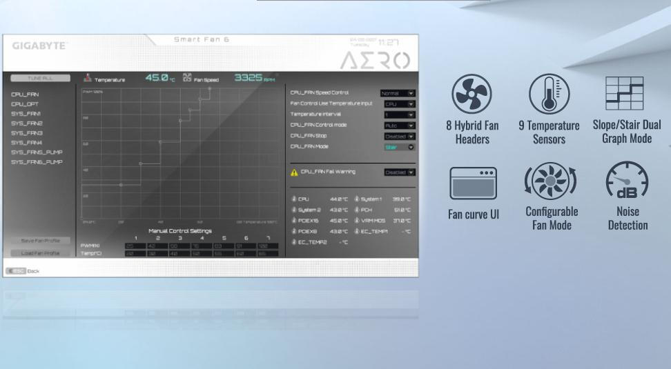 Το Smart Fan 6 της GIGABYTE διαθέτει απλή διαχείριση για να διασφαλίσει ότι το σύστημά σας παραμένει δροσερό και αθόρυβο υπό διαφορετικούς φόρτους εργασίας.