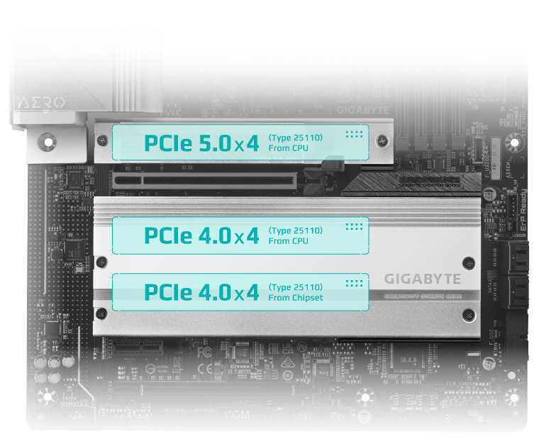 Όλες οι υποδοχές PCIe x4 M.2 παρέχουν υποστήριξη NVMe SSD RAID για βέλτιστη ενίσχυση, ενώ μία υποδοχή PCIe 5.0 M.2 προσφέρει υποστήριξη έως και τύπου 25110.