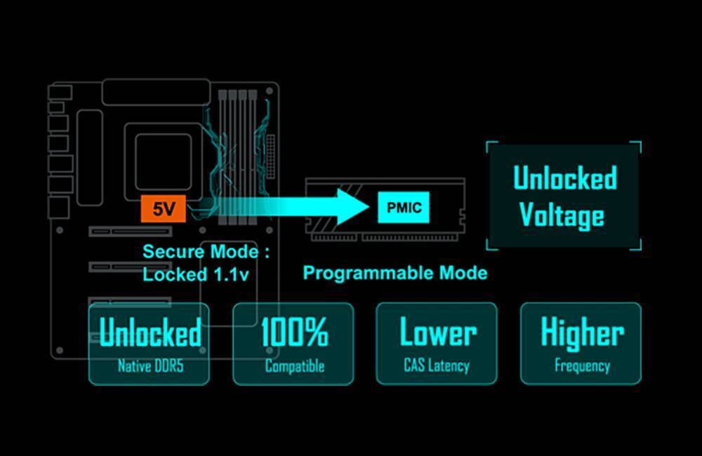 Η μητρική παρέχει σταθερή τάση 5V στη μνήμη DDR5 και ο ενσωματωμένος PMIC εξάγει κλειδωμένη τάση 1.1V προς το IC της μνήμης.