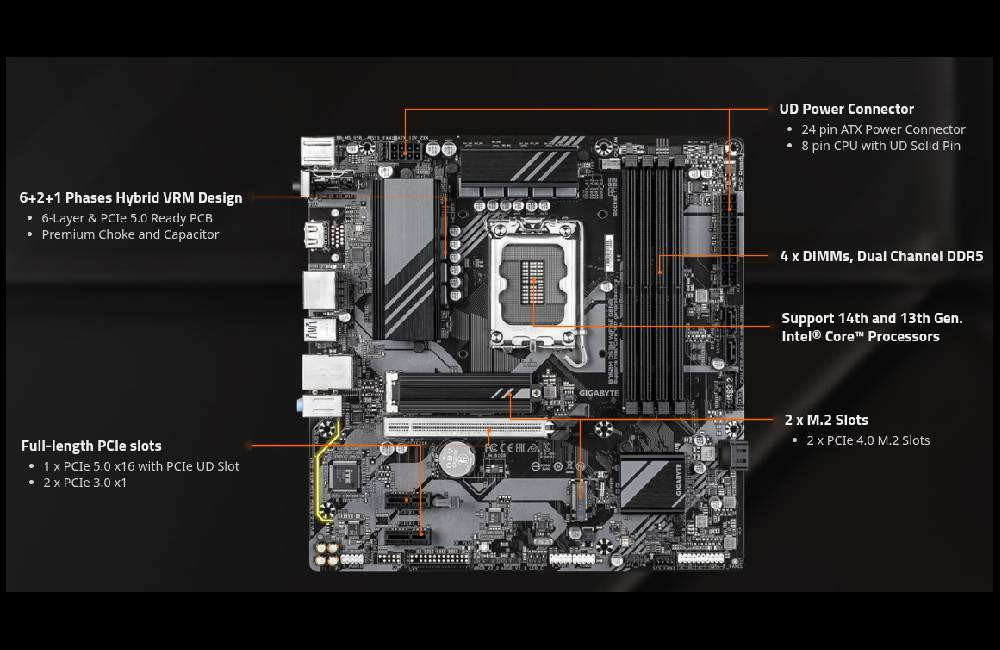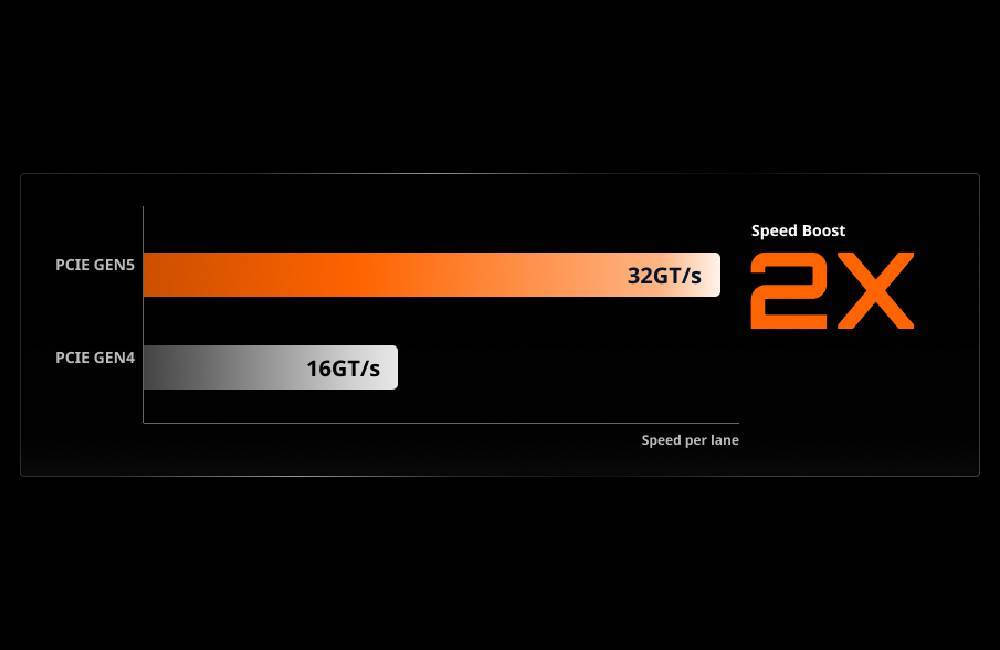 Οι νέες μητρικές GIGABYTE B760 προσφέρουν την πιο αποδοτική λύση για να αξιοποιήσεις τις ενισχυμένες επιδόσεις του PCIe Gen5 στην υπάρχουσα πλατφόρμα. Το PCIe 5.0 διπλασιάζει τον ρυθμό μεταφοράς δεδομένων σε σχέση με το PCIe 4.0 — από 16 GT/s σε 32 GT/s ανά γραμμή. Αυτή η σημαντική αύξηση στο εύρος ζώνης ωφελεί ιδιαίτερα τις κάρτες γραφικών υψηλών επιδόσεων, τις συσκευές αποθήκευσης και τους επιταχυντές AI που απαιτούν ταχύτερη μετακίνηση δεδομένων.